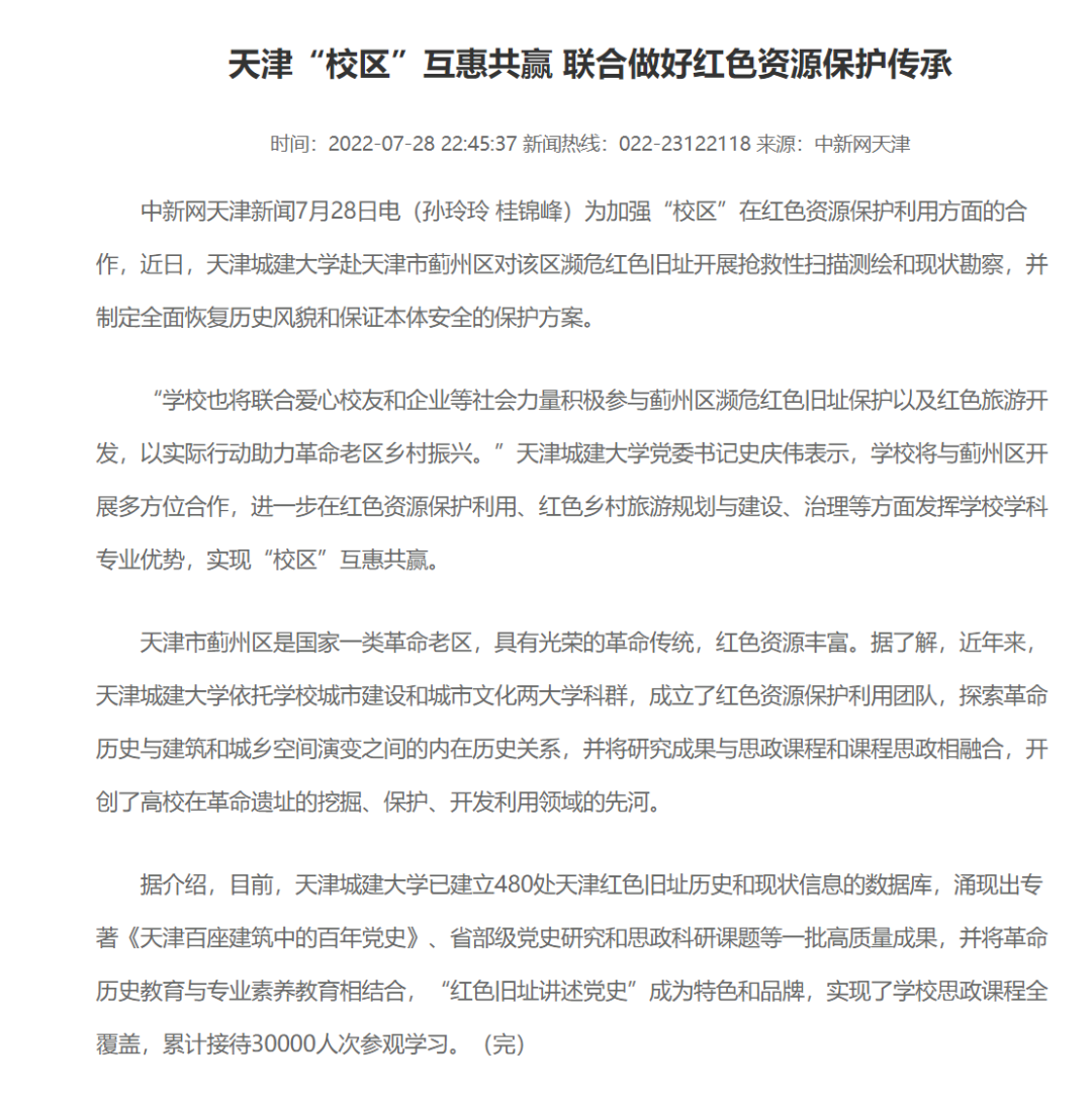 中国新闻网以“天津‘校区’互惠共赢 联合做好红色资源保护传承”为题对伟德官网工作进行报道