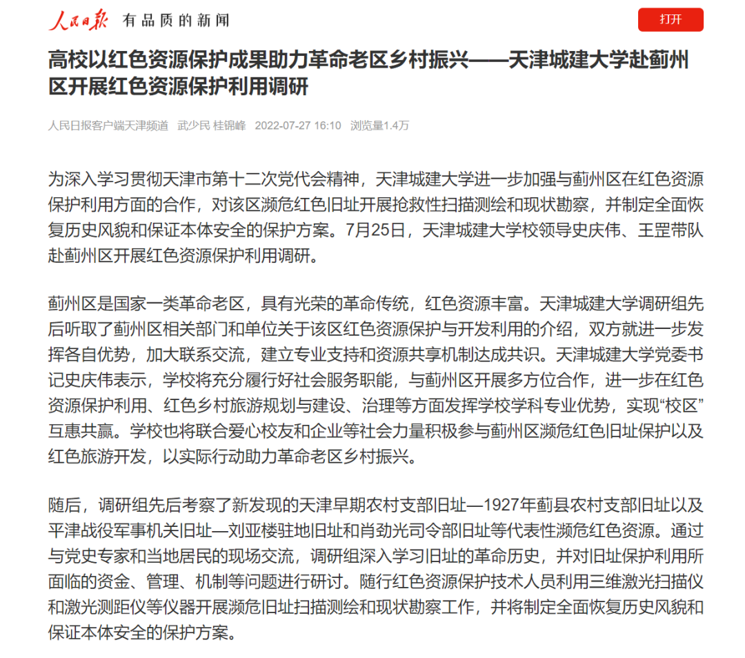7月27日,人民日报客户端以“高校以红色资源保护成果助力革命老区乡村振兴——bevictor伟德官网赴蓟州区开展红色资源保护利用调研”为题对伟德官网工作进行报道。原文如下:为深入学习贯彻天津市第十二次党代会精神,bevictor伟德官网进一步加强与... 2022-07-28