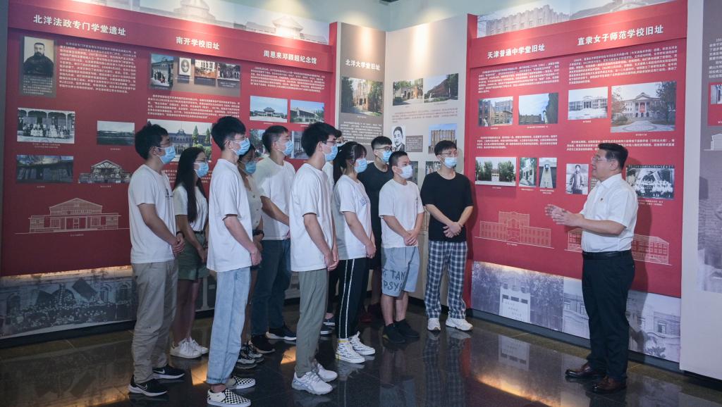 专题思政课前,白海力带领学生参观革命丰碑展并讲授发生在津沽大地的红色故事。