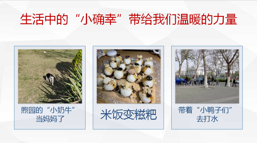 每天足不出户,同学们难免会有些焦躁,和她们相处时,我尽量用轻松的语气逗她们开心。“煦园的小猫当妈妈了;谁做的糍粑,这么有才华?海棠花开了,今天打水带你们绕个大圈,开不开心?”。我相信,在乐观和坚强面前,困难不值一提。