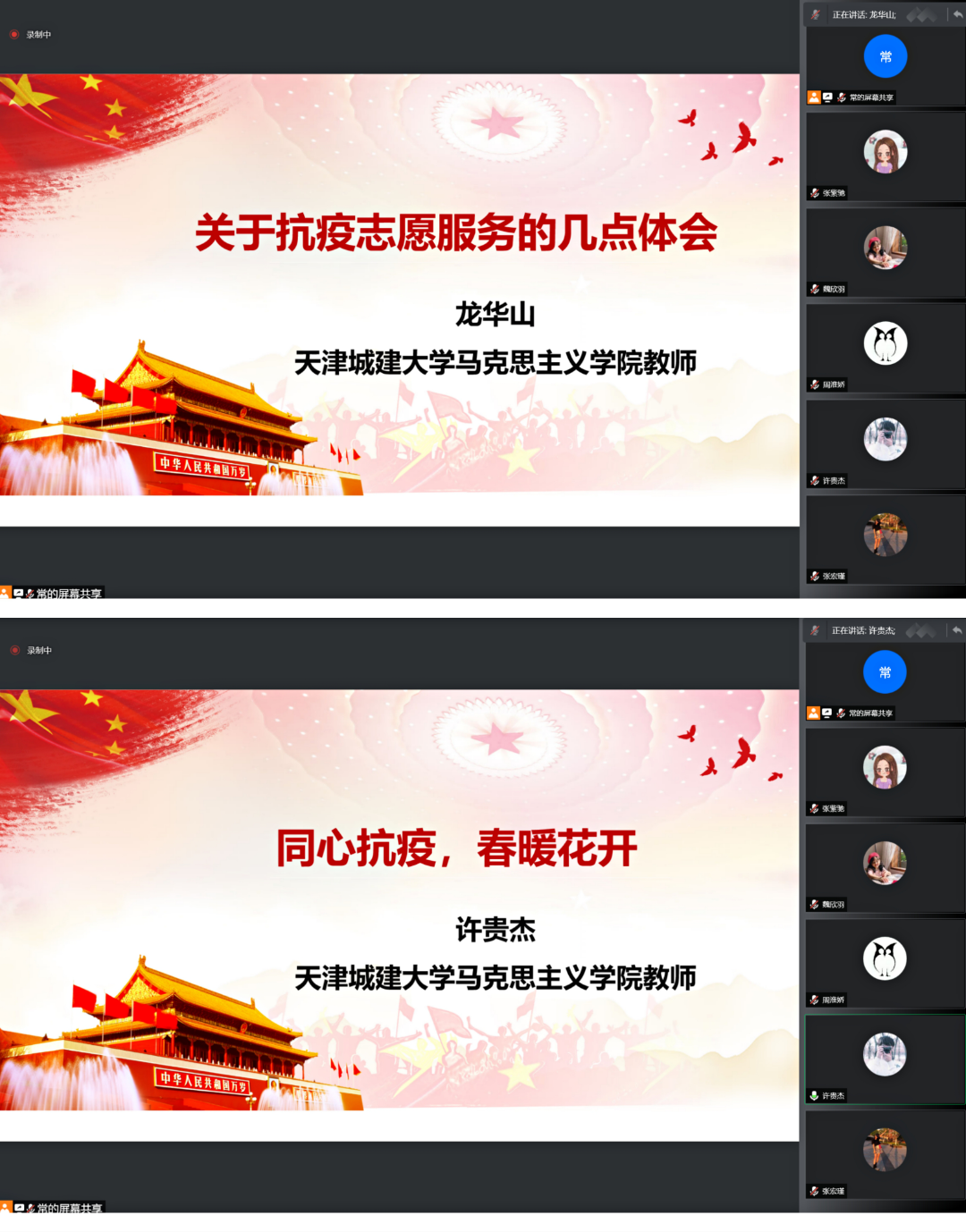 龙华山老师从参与志愿服务的切身经历和所见所闻,给大家描绘了一幅幅抗疫战斗的生动画面。许贵杰老师从迎难而上、服从指挥、齐心协力、精准防控四个方面分享了对学校取得疫情防控阶段性胜利经验的理解,并从立德树人的角度讲述了如何讲好抗疫思政课。