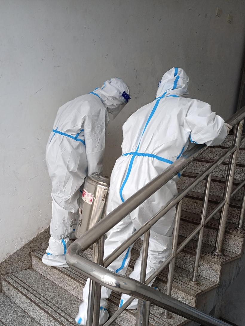 按照疫情防控要求,他们每天必须穿着厚重的防护服,为13000余名学生配送餐食和饮水到寝室门口。防护服下,是不间断的溽热与窒闷;面具后面,是一道道血红的勒痕。一天中,他们要抬着50斤重的水桶从一楼到六楼上下不停穿梭70余趟。水桶隔热效果不好,一不小心手就会被烫到;一天下来,志愿者们的衣服干了湿、湿了又干,上面析出了大片白花花的盐;长时间的负重爬楼,让他们的腰和膝盖都疼痛无比......但这些困难没有动摇他们坚定的眼神,没有人愿意轻易地“退下来”。