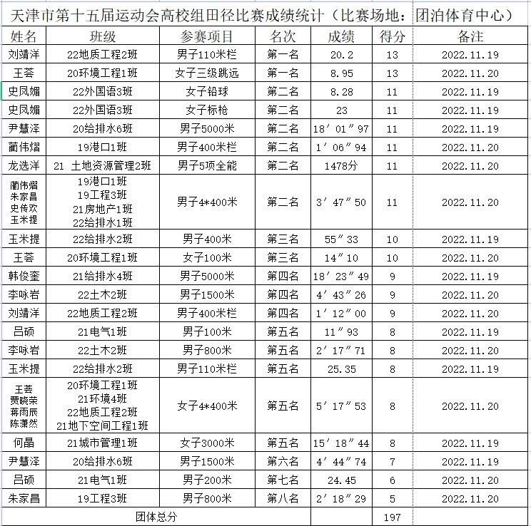 日前,天津市第十五届运动会(大学生组)田径比赛在团泊体育中心开展,全市各高校共计27支队伍参加比赛。伟德官网田径代表队获得第一名2项,第二名6项,第三名2项,第四名3项,第五名5项,第六、七、八名各1项的好成绩。