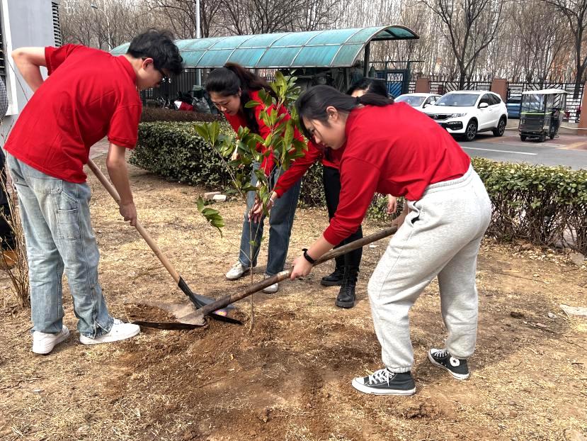 在植树活动现场,“红旗班”学员和预科班少数民族同学干劲十足,大家分工协作,挥锹铲土,填坑压实,各个环节衔接有序。经过紧张有序的劳动,一棵棵树苗纵横整齐、迎风挺立、绽放生机,为春天增添了浓浓绿意,成为了一道靓丽的风景线。