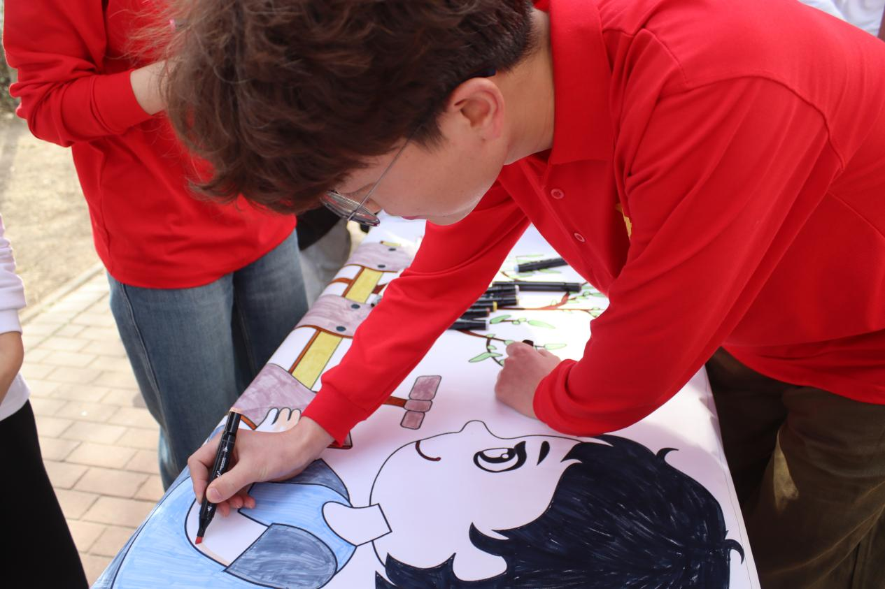 植树活动后,同学们积极参与“百米”画卷绘青春活动,大家以笔为媒、以纸为介、以画寄情,将青春朝气倾注笔端,认真专注,在五彩画笔交融之中展现新时代青年学子积极昂扬的风采与面貌。