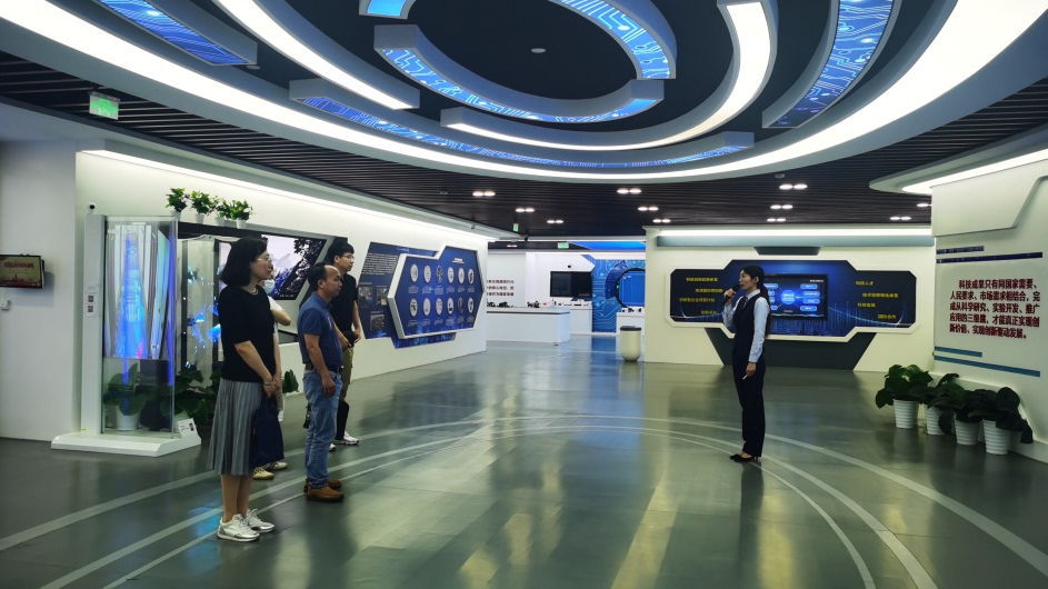 调研组一行参观了天津市科技成果展示交易运营中心展厅,在天津联创科技发展有限公司负责人田伟经理的介绍下,了解到该企业的用工需求、招聘岗位意向,并就天开高教科创园建设中关于创新创业的扶植政策进行了交流。