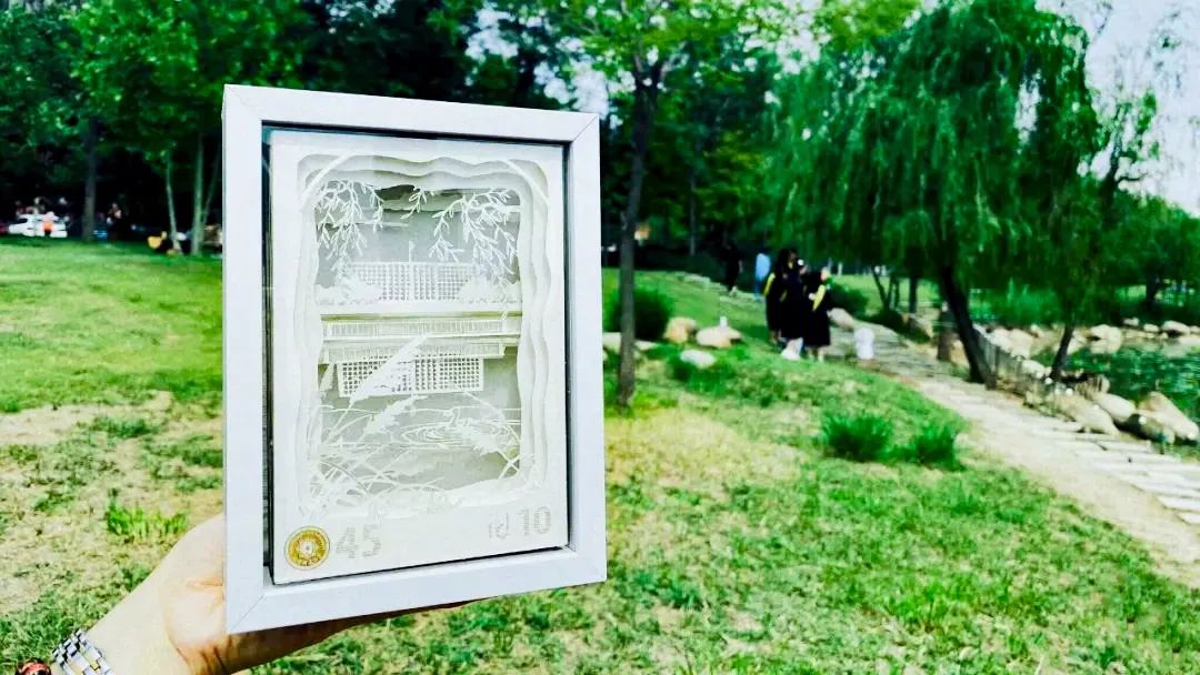 展览现场,同学们精心制作的毕业设计作品闪亮登场。其中,专为校庆而设计定制的文创纸雕灯,实现了从图案到内构电路的完全自主设计。核心部分的纸雕是原创的图案,图案设计参考了中心湖畔的风景,内部一共有10层不同功能的纸张,第一层在下部雕刻有城建45周年和工业设计10周年的logo;第二、三层分别是湖边的芦苇和柳条;中心湖是小鸭子的乐园,所以在第四、五两层设计了小鸭子的图案;第六层就是学校的标志性建筑——现代教育中心,第七层是天上的流云。纸雕间距4mm,在尽可能减少厚度的同时保证了立体感。纸雕灯在制造时采用先进的激光数控机床加工,除纸雕使用机器加工外,其余各个部分均为纯手工制作。