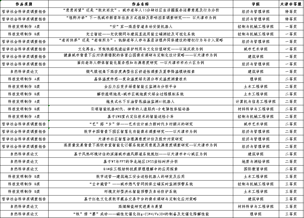 近日,由团市委、市委教育工委、市教委、市科技局、市科协、天津社科院、市社科联、市学联主办的第十七届“挑战杯”天津市大学生课外学术科技作品竞赛获奖作品名单公布。伟德官网市赛奖项所获数量和种类再创新高!共28项作品获奖,其中,特等奖2项,一等奖7项,二等奖13项,三等奖6项。