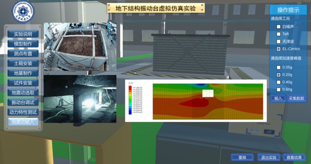 本实验紧密结合课堂教学、现场体验、视频展示等多种教学方式开展教学。通过课堂学习理论知识,现场体验动三轴仪、振动台、剪切土箱等设备,视频展示实验过程,再通过本虚拟实验亲身体验整个实验过程,利用这种循序渐进的教学过程,使学生全面掌握土动三轴实验、地下结构振动台实验以及地下结构震害特点。