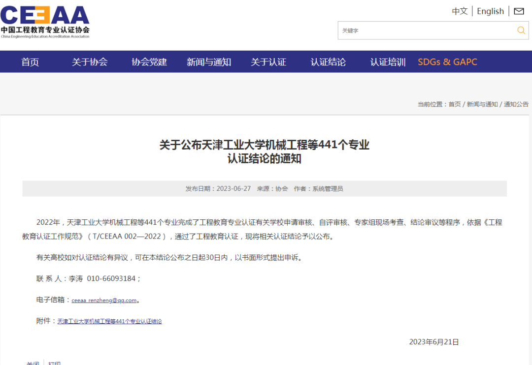 日前,中国工程教育专业认证协会官网发布《关于公布天津工业大学机械工程等441个专业认证结论的通知》,伟德官网机械设计制造及其自动化专业、环境工程专业通过了工程教育认证,有效期为六年(有条件),认证结论有效期起止时间为2023年1月至2028年12月。
