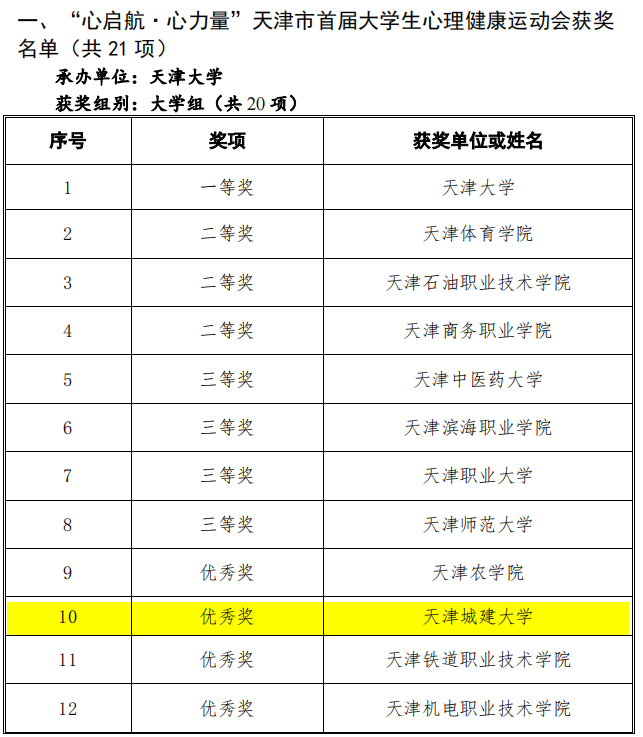 由来自城市艺术学院的唐梓晨、土木工程学院的尤成杰、国际教育学院的王子航等10人组成的心理运动会代表队获天津市首届大学生心理健康运动会优秀奖。赛场上他们以敢于拼搏、勇于挑战的精神面貌,舞动了青春的热情,生动诠释了伟德官网大学生的青春风采。