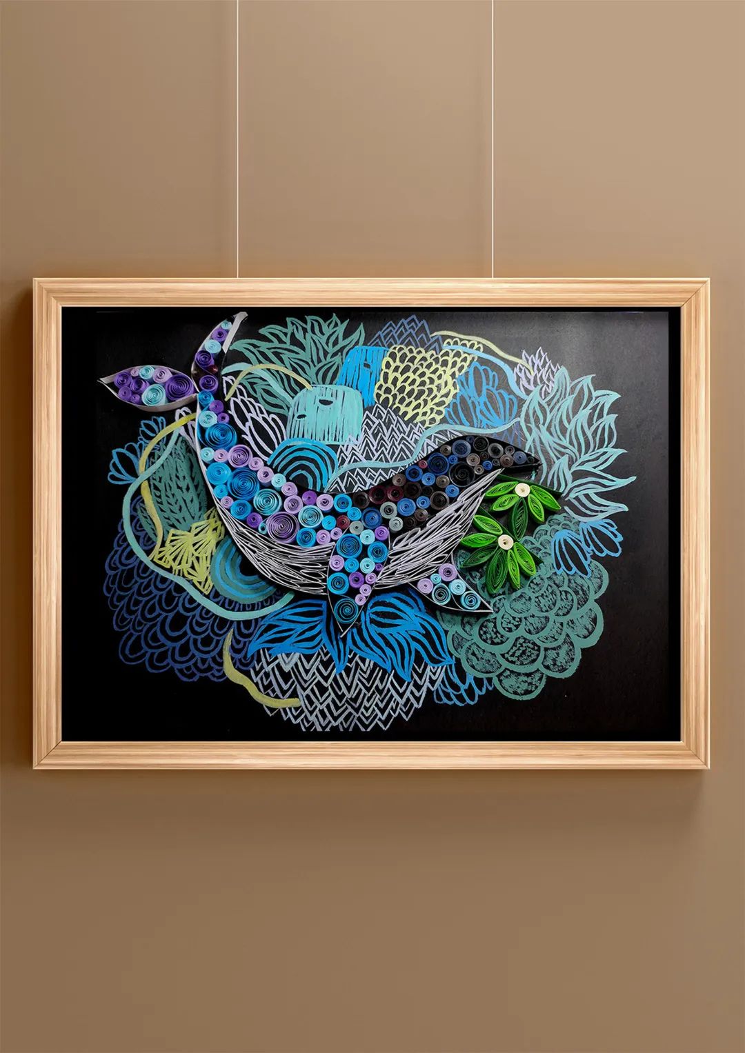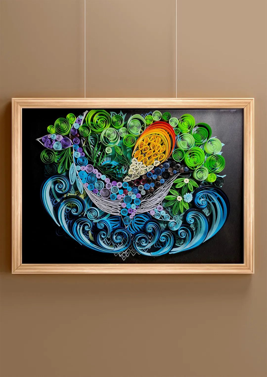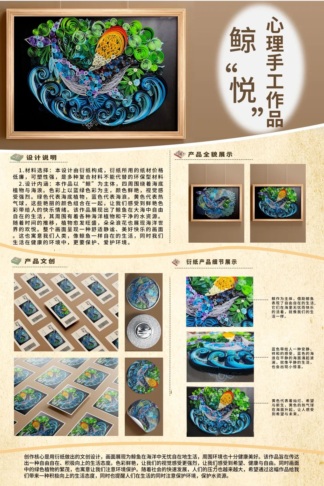 作品由衍纸构成,画面展现为鲸鱼在海洋中无忧自在地生活,其周围有着各种海洋植物和干净的水资源。随着时间的推移,植物愈发旺盛,朵朵浪花也展现海洋世界的欢悦。旨在传达出一种自由自在、积极向上的生活态度。作品色彩鲜艳,让我们的视觉感受更强烈,让我们感受到希望、健康与自由。同时画面中的绿色植物的繁茂,也寓意让我们注意环境保护。随着社会的快速发展,人们的压力也越来越大,希望通过这幅作品给我们带来一种积极向上的生活态度,同时也提醒人们在生活时注意保护环境,保护水资源。
