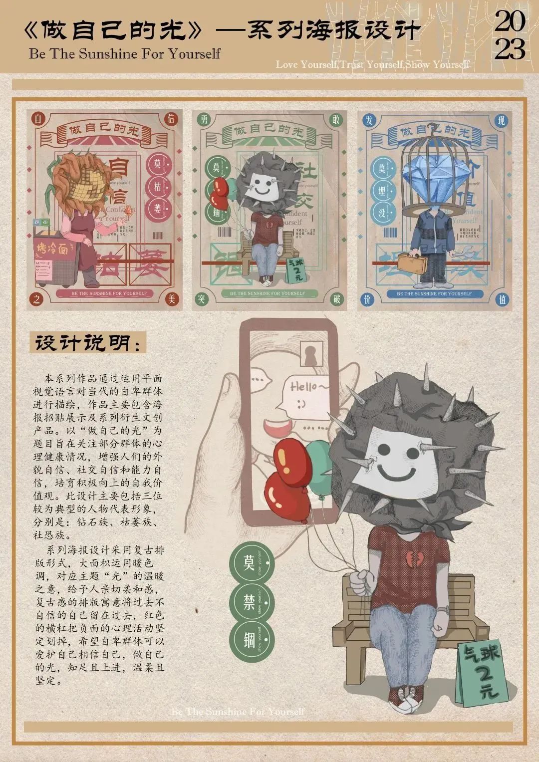 作品通过运用平面视觉语言进行描绘,主要包含海报招贴展示及系列衍生文创产品,以“做自己的光” 为题目旨在呼吁人们注重调节自身情绪状态,增强人们的外貌自信、社交自信、能力自信,培育积极向上的自我价值观。海报设计采用复古排版形式,大面积运用暖色调,对应主题“光”的温暖之意,给予人亲切柔和感的同时鼓劢人们勇敢突破,相信自己,做自己的光。