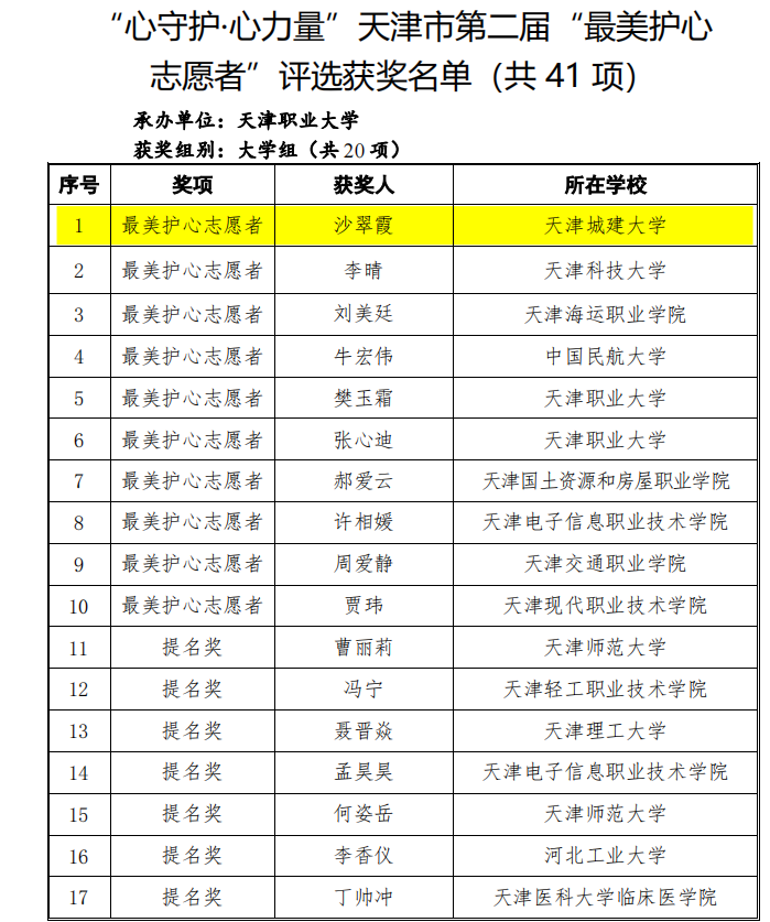党委学生工作部教师沙翠霞荣获天津市第二届“最美护心志愿者”称号。10年春秋,沙翠霞致力于用自己的专业和热爱为学生撑起心理健康保护伞,2020年2月成为天津市教育系统师生心理热线首批志愿者,并坚守3年至今,参与志愿服务在岗时长236小时,为数名家长和学生提供心理支持。2020年、2022年荣获志愿服务荣誉证书,2021年荣获“天津市阳光心理热线优秀志愿者”称号。