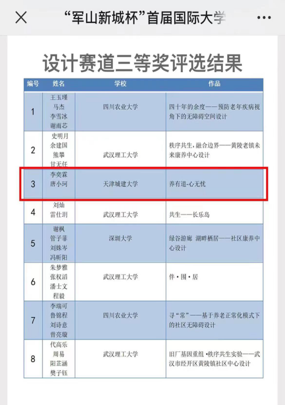 近日,“军山新城杯”首届国际大学生绿色智慧城市设计大赛颁奖仪式在武汉理工大学举行。伟德官网建筑学院2020级城乡规划专业学生李奕霖、唐小珂的作品“养有道,心无忌——基于智慧城市背景下的无障碍康养社区设计”在本届竞赛中获得设计赛道三等奖及奖金1万元。