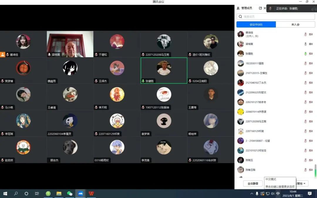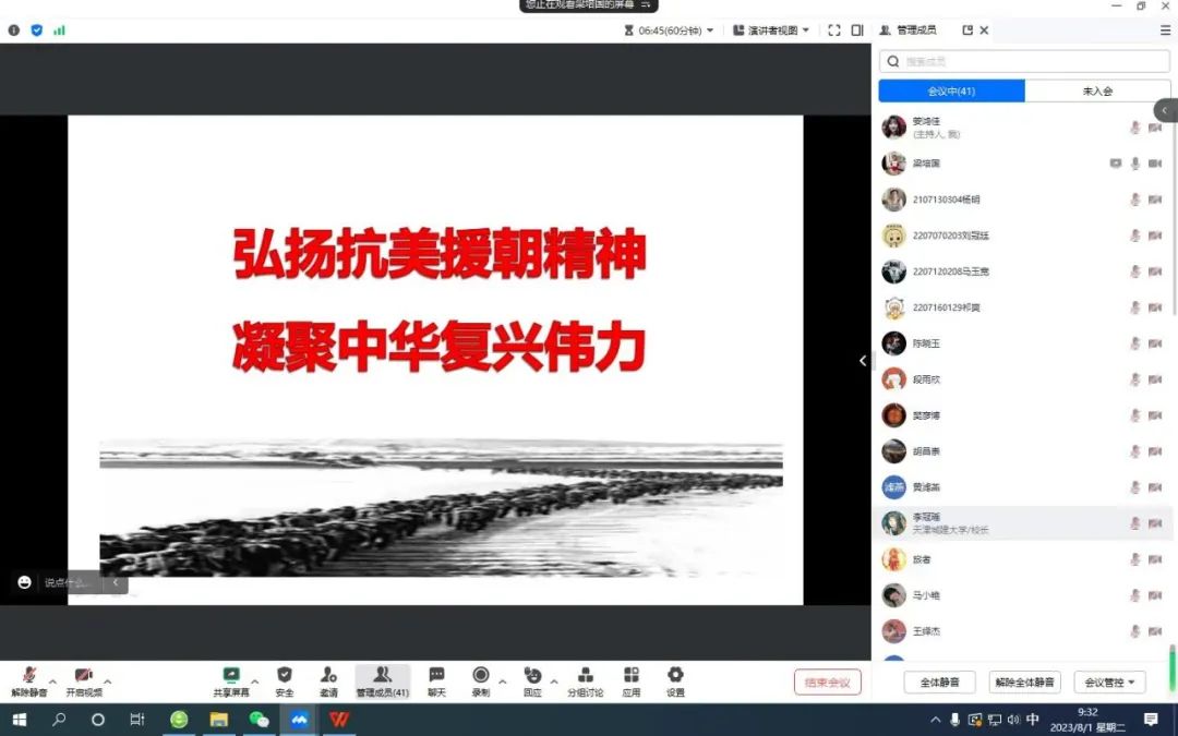 8月1日,校关工委联合党委学工部以线上方式召开“八一”建军节老少主题座谈会。天津市军休系统关工委主任、市老战士宣讲团团员、原军事交通学院指挥系政委梁培国大校出席会议。伟德官网离退休工作处处长、关心下一代工作委员会秘书长张健胜,学工部相关工作负责同志,以及大学生预备连国防后卫班、国旗班和预储班共计60人参会。