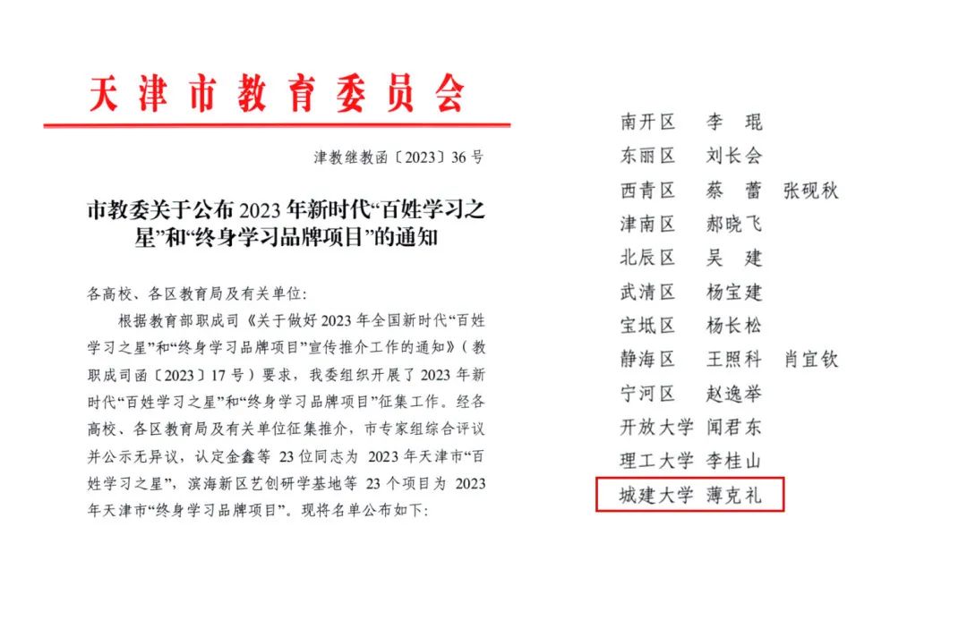 近日,天津市教育委员会公布2023年新时代“百姓学习之星”和“终身学习品牌项目”评选结果,伟德官网马克思主义学院教师薄克礼荣获2023年新时代“百姓学习之星”荣誉称号。
