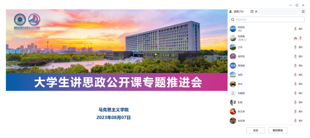 指导教师们分别汇报了现阶段团队工作进度,相互进行了经验分享。教师彭聪表示,动员部署会对大赛规则和标准的介绍以及专题推进会的交流非常及时、实用,为进一步指导团队参赛明晰了方向,提供了方法,接下来将按照学院进度安排,结合自己参加思政课大比武的经验,继续精心指导学生参赛。