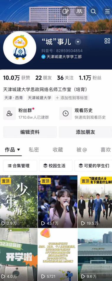 在学校党委高度重视和坚强领导下,“‘城’事儿”工作室坚持以立德树人为根本任务,以理想信念教育为核心,以深化“三全育人”为落脚点,以凝聚校园共识、讲好师生故事为工作理念,关注社会微观视角、学生关切和潮流话题,解锁属于天城大的创意短视频时代。根据学生工作实际,注重精耕细作、着力打磨精品,不断提升网络思政“黏性”,打造思想性、趣味性的内容供给。工作室建设培育期内,“‘城’事儿”抖音号共发布作品数42个,粉丝数1.1万,推出专属卡通形象,总视频浏览量超过350万,总获赞量达10万,其中作品《成功没有捷径,谨防落入骗局》单条视频点赞量达2.1万,毕业典礼歌曲快闪视频点赞量超4300,利用学生喜闻乐见的方式提升网络育人实效。