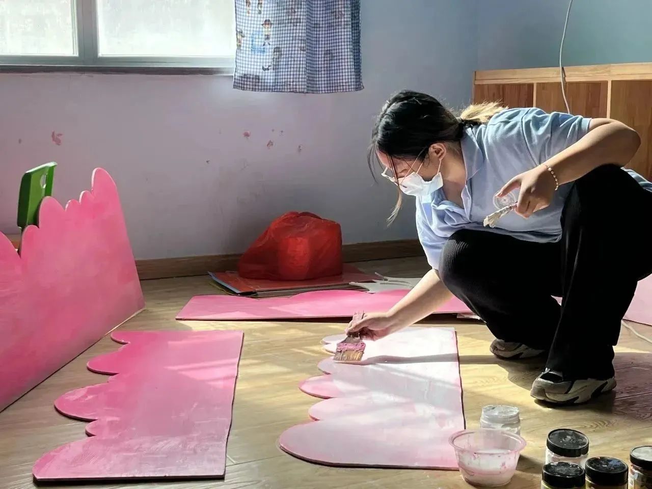 基础教学工作安排之外,赴疆支教团成员们尽己所能,用专业特色开展创意性工作。小学组成员设计墙绘图案,计划对于田县第二小学操场的主席台墙体进行彩绘升级,形成墙绘预览图;幼儿园组成员发挥美术特长,对教室空间的文创区域进行布局设计制作,将专业特色融入到支教工作之中,将画笔涂抹在祖国边疆,让青春之花绽放在祖国最需要的地方。