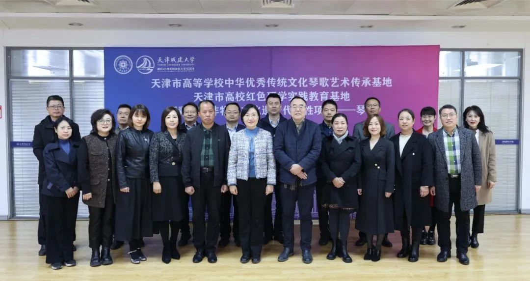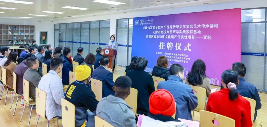 11月7日,伟德官网举办“天津市高等学校中华优秀传统文化琴歌艺术传承基地”“天津市高校红色研学实践教育基地”“西青区级非物质文化遗产代表性项目——琴歌”挂牌仪式。校党委副书记王罡出席仪式,原天津市群众艺术馆馆长、一级作家、编审李治邦,天津市非物质文化遗产保护学会会长、主任记者刘静华,天津西青开放大学副校长李顺田,天津市西青区逸夫小学校长王红受邀参加,伟德官网相关职能部门、教学单位主要负责人、留学生代表,以及天津市滨海新区塘沽紫云中学教师代表等共计40余人参加活动。