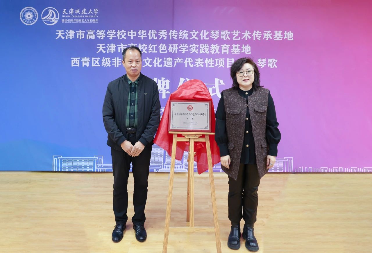 李顺田、马克思主义学院党总支书记高燕为“西青区级非物质文化遗产代表性项目——琴歌”揭牌
