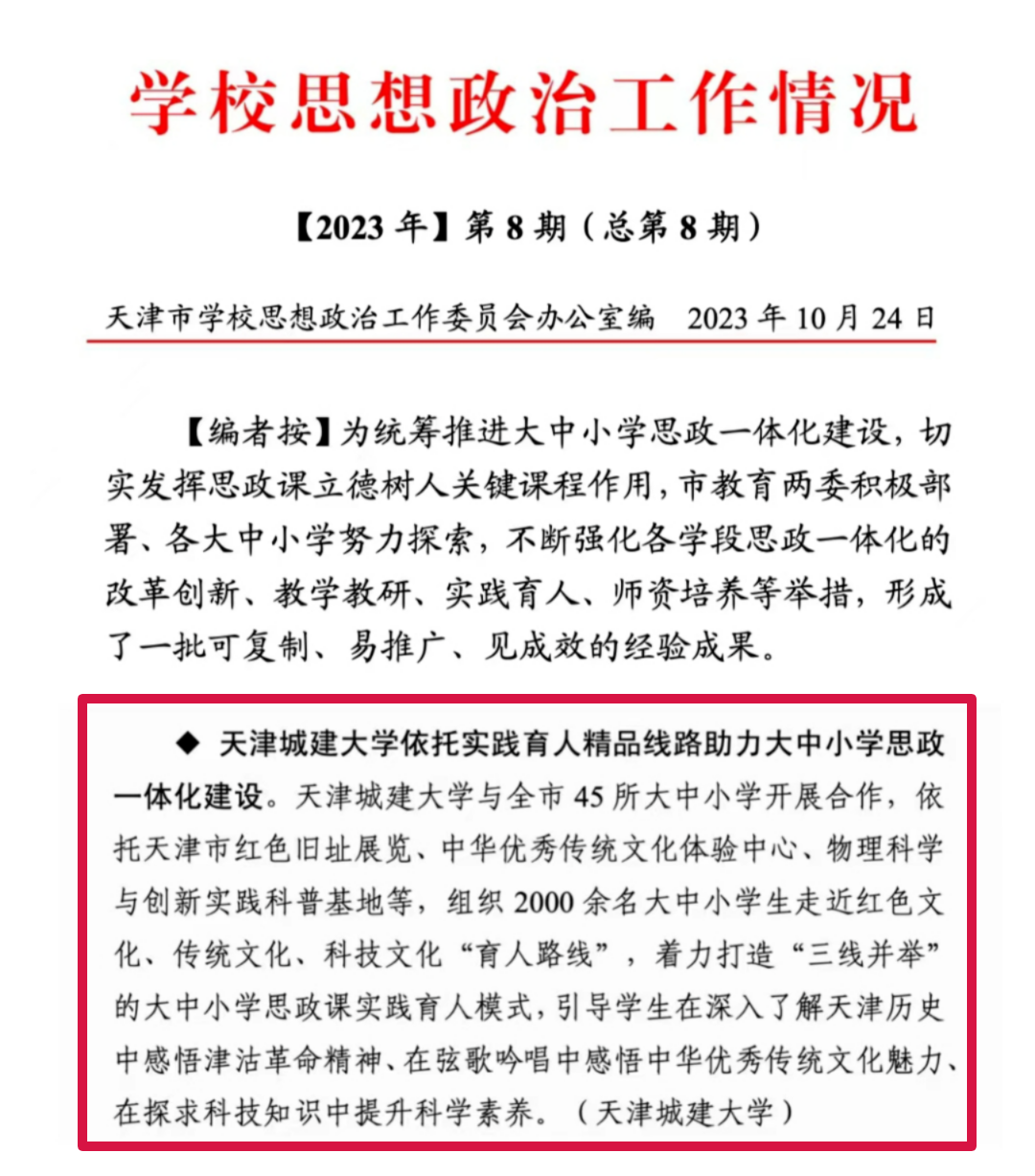 近日,伟德官网依托实践育人精品线路助力大中小学思政一体化建设经验做法被天津市学校思想政治工作委员会汇编的《学校思想政治工作情况》【2023年】第8期(总第8期)收录。现将原文整理如下: