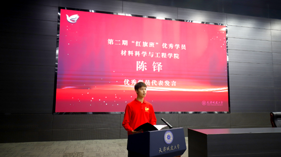 开班仪式在庄严的国歌声中拉开帷幕,随后第二期“红旗班”优秀学员代表,材料科学与工程学院陈铎同学代表“红旗班”进行发言,他表示通过一年的学习更加坚定了对马克思主义和中国特色社会主义的信仰,拥有了更好的实践平台去练就过硬本领,未来他们将继续用实际行动彰显新时代青年“敢于担当、勇于作为”的如磐精神和“笃行实干、惟实励新”的坚定信念,继续书写不负时代的青春答卷。