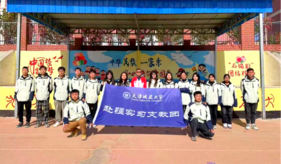 9月18日,经过前期多次实地考察,支教团小学组全体成员发现于田县第二小学的体育场舞台背景急需翻新绘制后主动承担绘制墙面工作。在和校方积极沟通、反复商定后,支教团多次开会研讨,墙面的主题确定为《中华民族一家亲,同心共筑中国梦》。