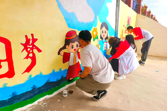 经过支教队员们的不懈努力,原本老旧的墙体焕发出了新的生机,为校园带来了浓烈的艺术气息。浓墨渲染韵律之美,颜料勾勒多彩校园,默默地墙壁变成无声的言语、隐形的课堂,激励全体师生迈出奋进的脚步。