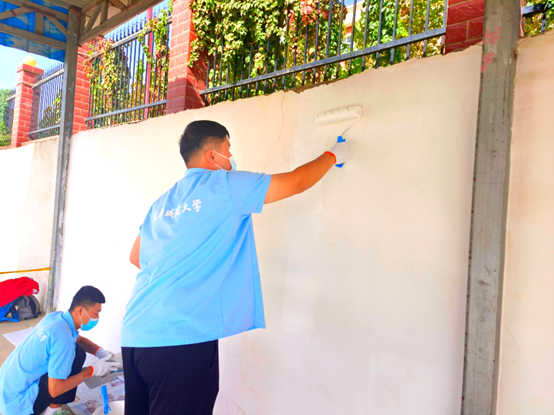 bevictor伟德官网支教团成员们团结协作、分工明确、全身心投入到墙绘工作中。清洁墙面、刷漆、描字、调色、摹画,墙绘工作井然有序地进行着。由于当地太阳照射极为强烈,团队成员常常汗流浃背,顶着刺眼的阳光和满目的粉尘进行工作,墙画工作组的老师和同学们从日出画到日落,他们不怕脏、不怕累,经过连续不间断的紧张工作,终于在10月23日顺利完工