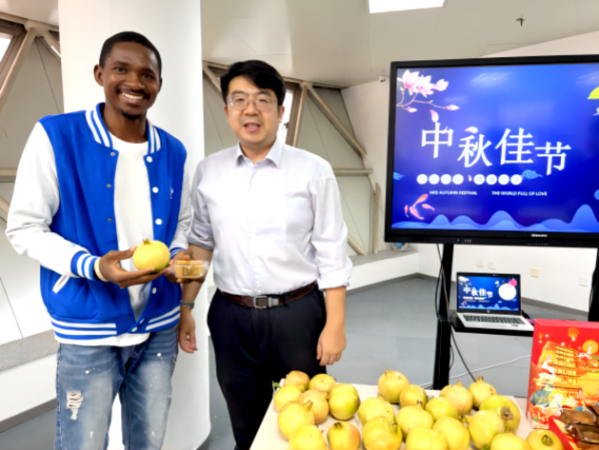 活动伊始,汉语言教师图文并茂、生动详细地为留学生讲解了中秋节的起源,以及赏月、吃月饼、品石榴的习俗,随后,学院领导为留学生发放月饼和石榴。院长张海代表学院为留学生送上中秋祝福,鼓励大家要积极向家乡人民宣传介绍中国天津,争做中外人文交流的实践者和推动者,成为增进各国人民相互了解和友谊的桥梁和纽带。中外师生们一边品尝月饼一边共叙友情,留学生们在中国故事中,体会到了中国传统文化的博大精深和源远流长。