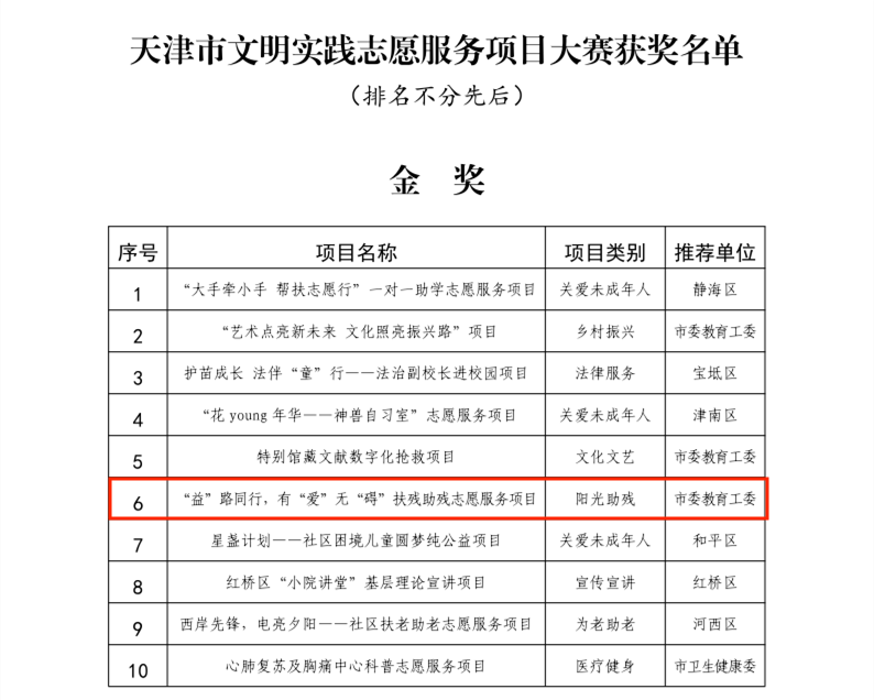 为深入贯彻落实党的二十大精神,落实全国宣传思想文化工作会议要求,聚焦推动我市高质量发展“十项行动”,推进文明实践志愿服务制度化常态化,市委宣传部、市文明办等26个部门联合开展的“学雷锋 做雷锋 共建天津志愿城”文明实践志愿服务项目大赛顺利举行。大赛共评选出10个金奖、30个银奖、60个铜奖,共计100个全市优秀文明实践志愿服务项目和14个优秀组织奖。伟德官网推选的“益”路同行 有爱无“碍”扶残助残志愿服务项目荣获金奖。