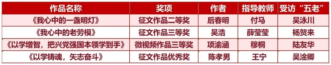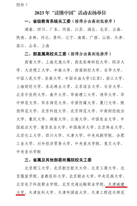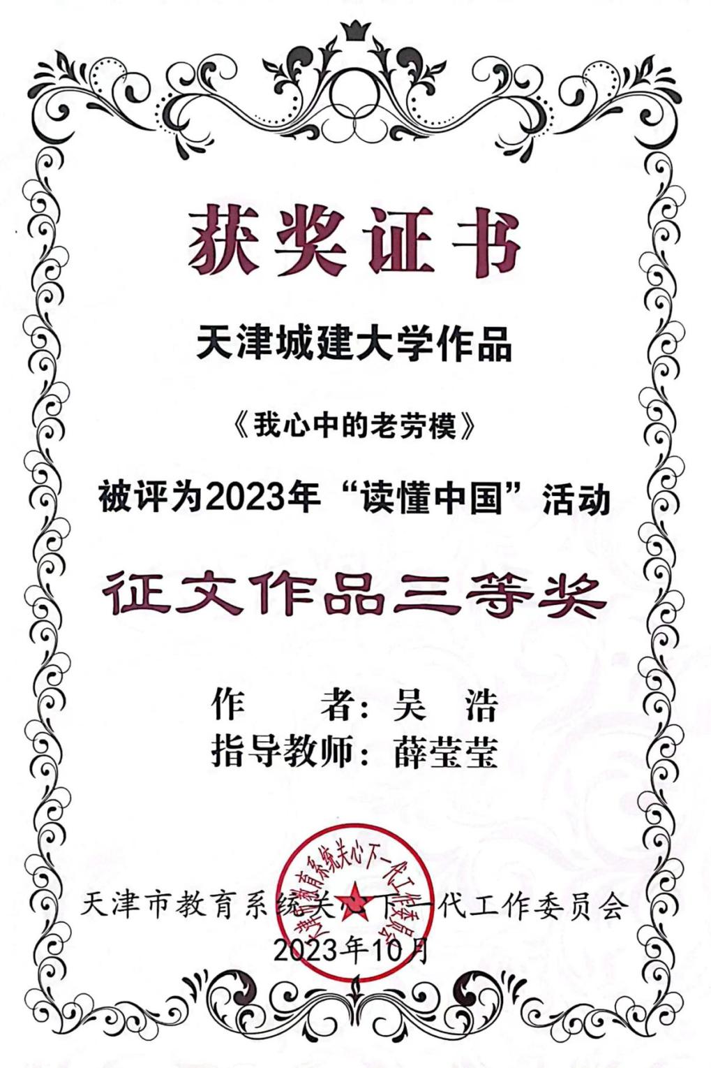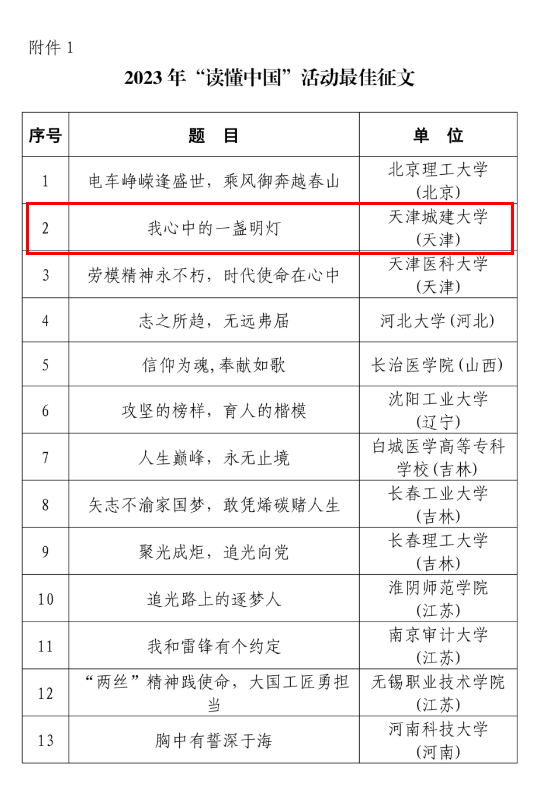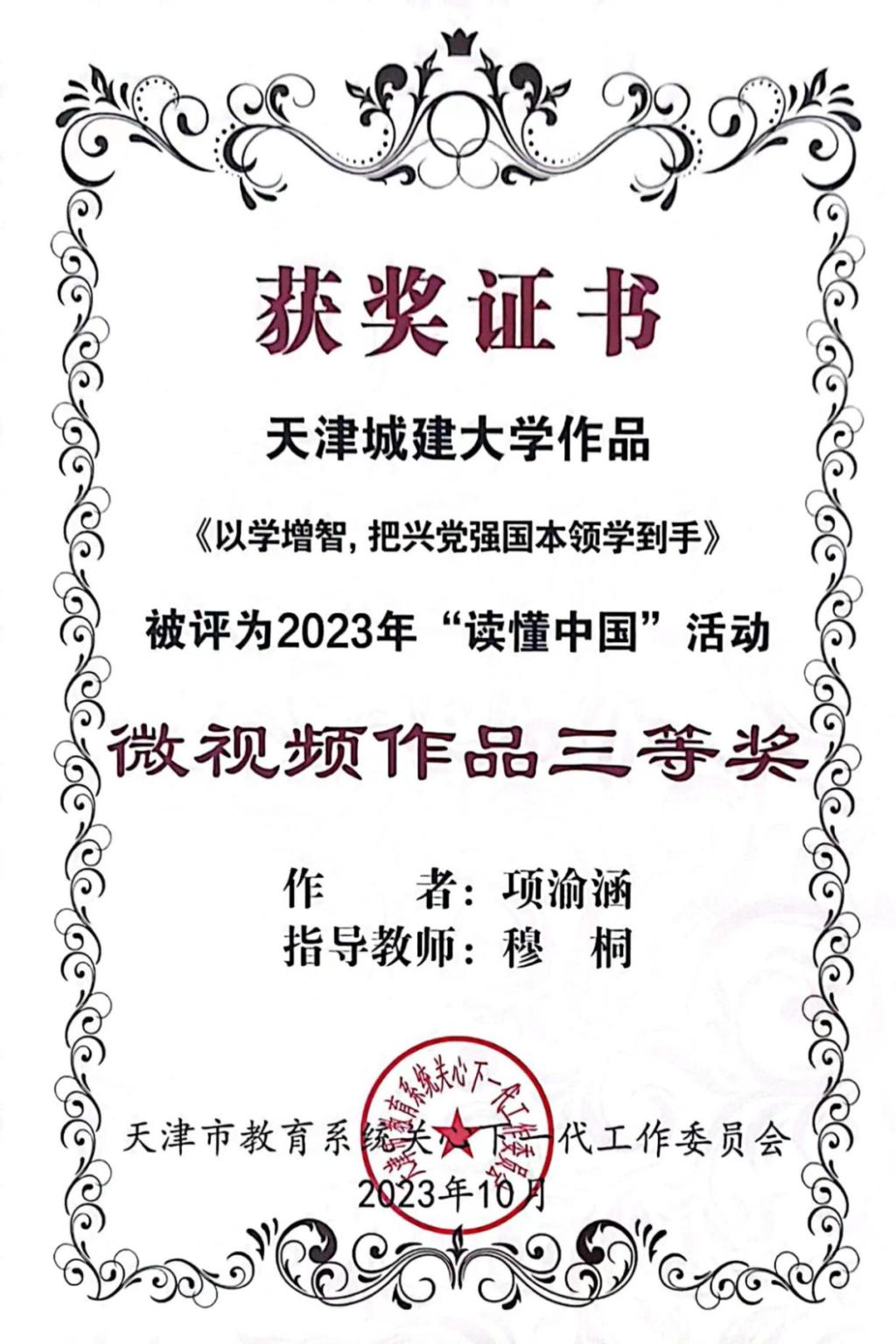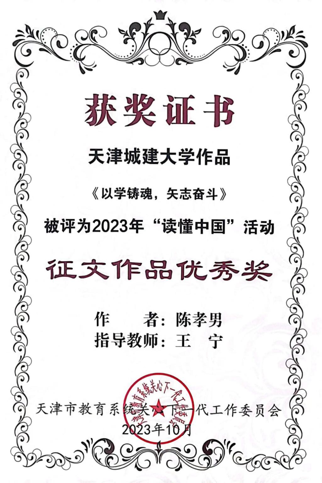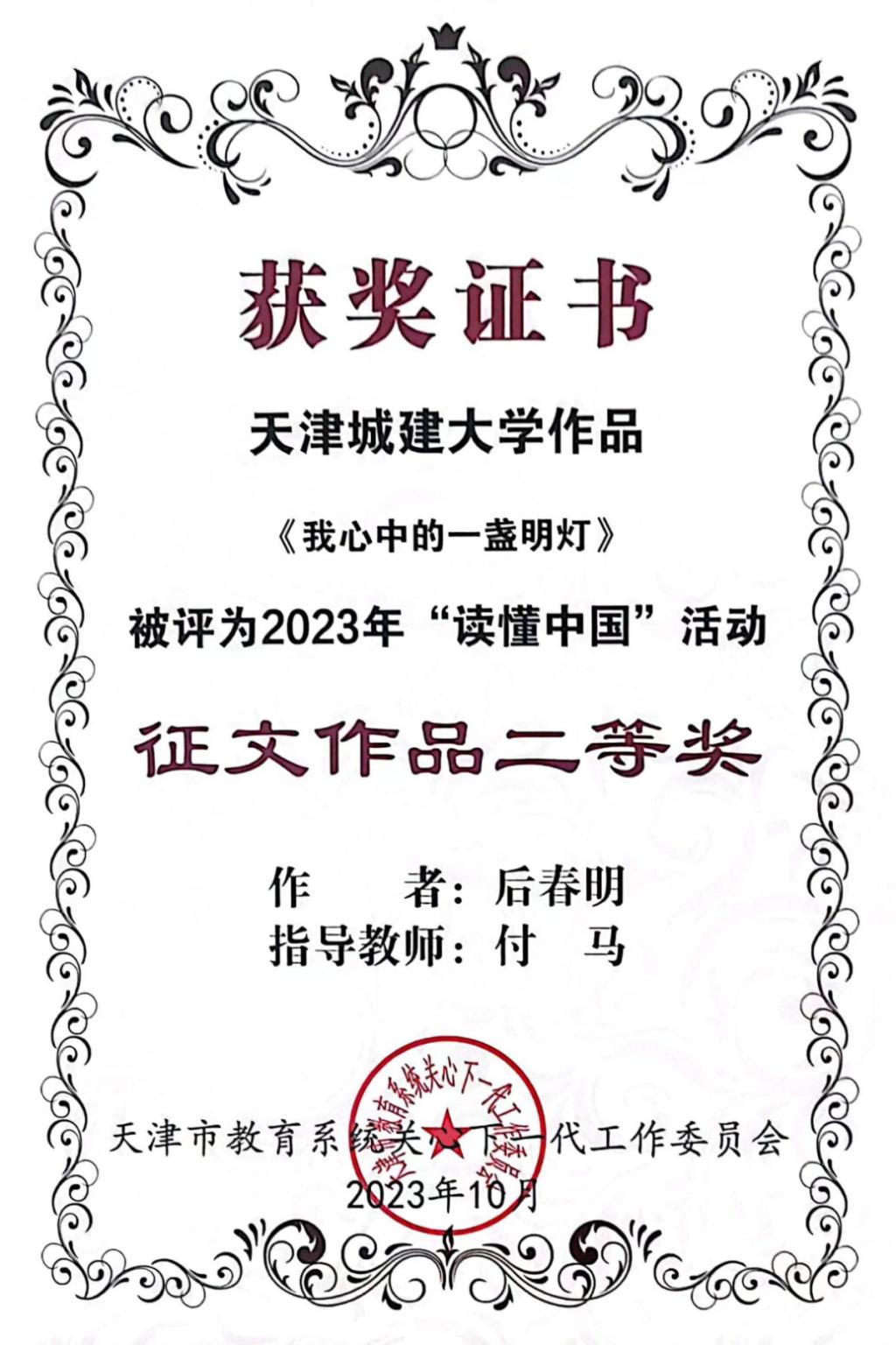 活动开始以来,天津市教育系统关工委按照教育部关工委部署,以“老少共话二十大,踔厉奋发新征程”为主题,大力推动“读懂中国”活动,学校党委高度重视,校院两级关工委组织动员广大“五老”和青年学生认真准备,积极参加,打磨精品,择优报送。最终有3篇征文、1个视频分别荣获征文作品二等奖1项、三等奖1项、优秀奖1项,微视频作品三等奖1项。