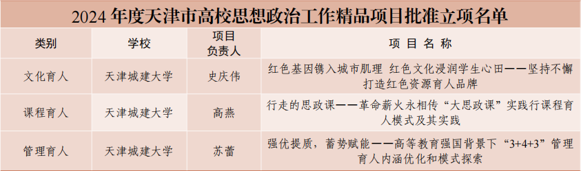 在2024年度批准立项的50项天津市高校思想政治工作精品项目中,伟德官网在文化育人、课程育人、管理育人类别中共有3个项目脱颖而出,入选2024年度天津市高校思想政治工作精品项目批准立项名单。