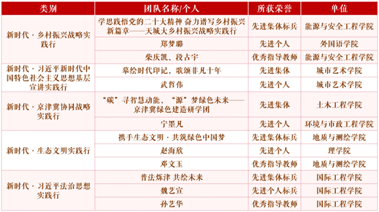 近日,市教育两委公布2023年“青春心向党,奋进新征程”新时代·实践行系列活动暨“青年红色筑梦之旅”主题实践活动评审结果,伟德官网师生分别在“新时代·乡村振兴战略实践行”“新时代·习近平新时代中国特色社会主义思想基层宣讲实践行”“新时代·京津冀协同战略实践行”“新时代·生态文明实践行”和“新时代·习近平法治思想实践行”主题方向中荣获先进集体和先进个人,并荣获3项“先进集体标兵”、2项“先进集体”、1项“先进个人标兵”、4项“先进个人”、3项“优秀指导教师”。