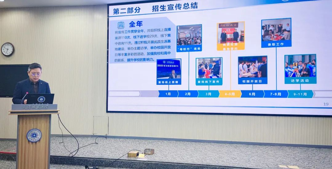 会上,教务处(招生办公室)副主任陈烜从录取数据分析、招生宣传总结和来年工作重点三个方面进行了2023年度招生工作总结汇报。通过对录取数据的多角度分析、介绍了伟德官网在全国33个省、市、自治区的录取位次变化情况和伟德官网在津招生的录取情况;以服务考生及家长为初心、以提高伟德官网生源质量为目标,学校精心设计了全年的招生宣传工作内容,突出多角色参与、多形式交叉,以“全年、全员、全渠道”的招生宣传模式为抓手,顺利完成了招生宣传的每一项工作;根据本年度招生宣传工作的经验及学生群体的调研反馈,对来年招生宣传工作进行了重点谋划。