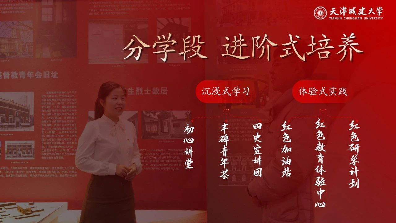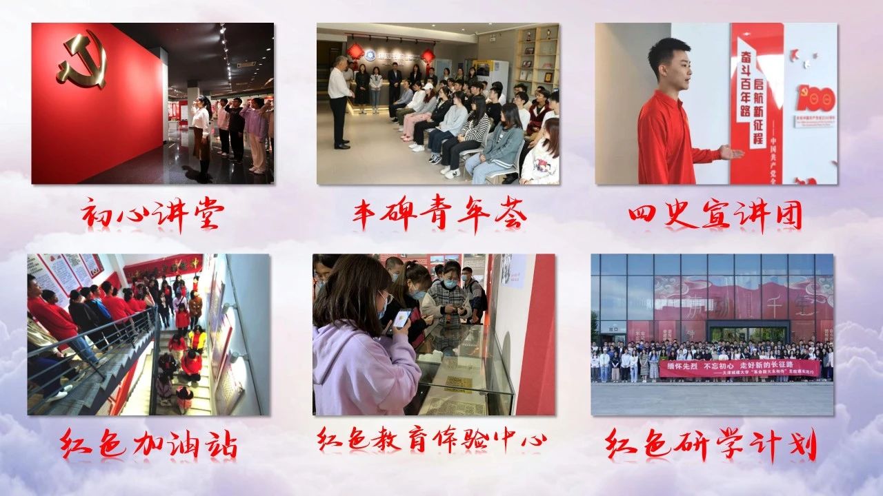 坚持发挥党建在思政工作中的引领作用,将理想信念教育作为学生第一课。用好学校红色资源,依托革命丰碑展馆这一红色平台,面向不同年级、不同群体进行分学段、进阶式培养。以“沉浸式学习”+“体验式实践”为主线,创立“初心讲堂”、“丰碑”青年荟等6个精品项目,开展活动千余次,被人民日报、高校思政网等媒体报道。丰碑领航辅导员工作室也成功获批天津市首批辅导员工作室。党旗所指就是团旗所向,学院1个支部获评全国活力团支部、3个支部获评天津市五四红旗团支部。破“圈”之下,天城大青年跑出了青春“加速度”。