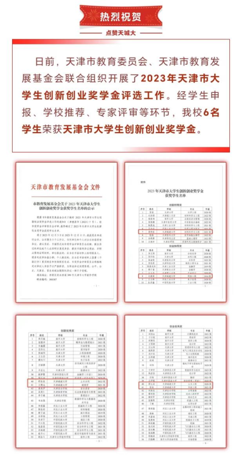 荣获天津市创新创业奖学金6项,其中,特等奖学金2项、优秀奖学金4项