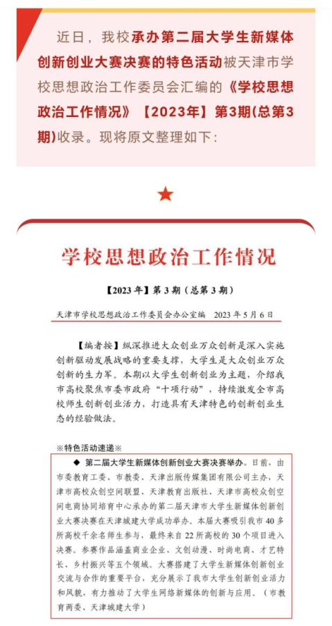 承办天津市新媒体创新创业大赛被《学校思想政治工作情况》作为特色活动收录