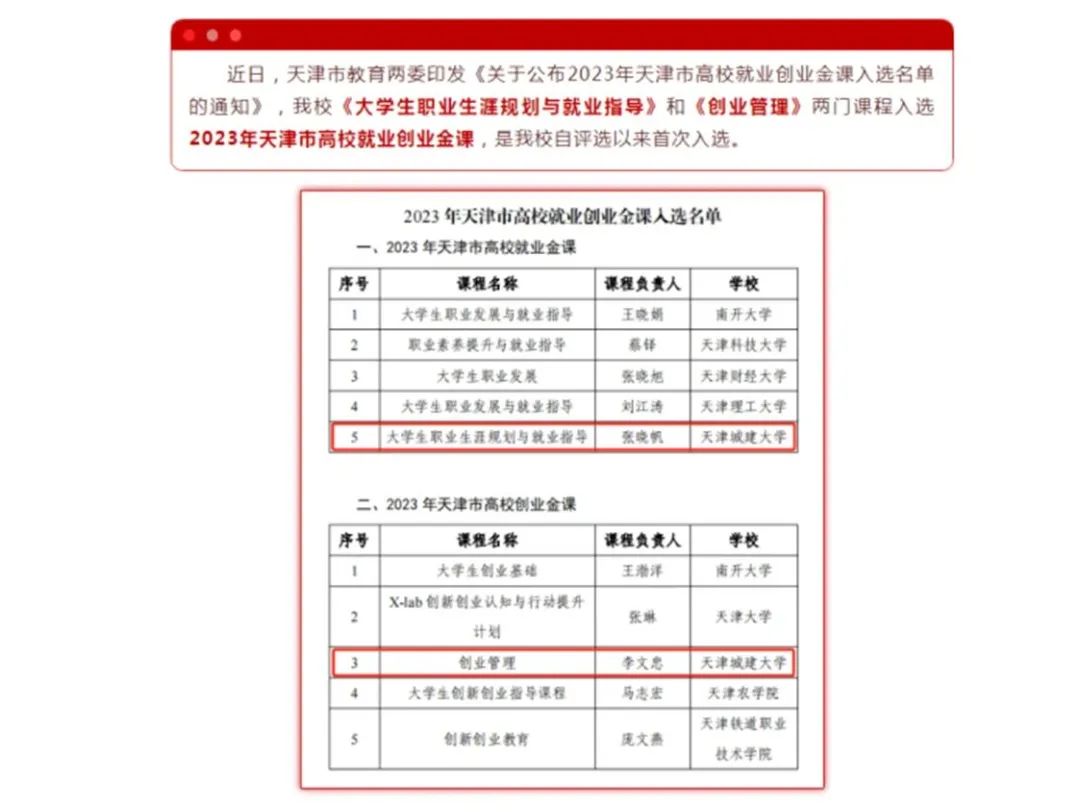 获批2门天津市高校就业创业金课