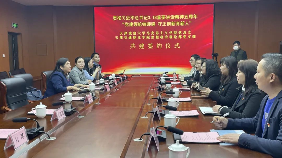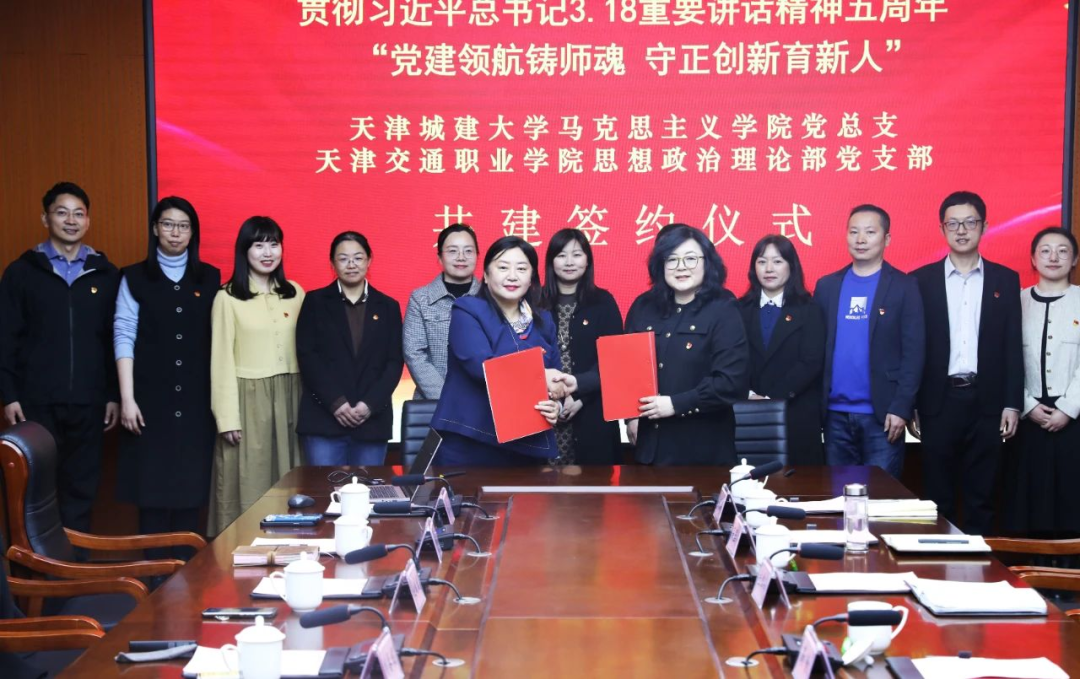 随后,双方在天津交通职业学院新综合楼报告厅内签订了党组织结对共建协议。在签订仪式上,刘春媚介绍了天津交通职业学院思政部党支部作为天津市第二批党建工作样板支部创建培育单位的建设情况,高燕围绕六大品牌创建汇报了bevictor伟德官网马克思主义学院近年来所取得的成绩。