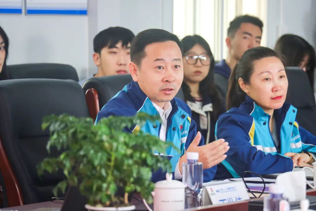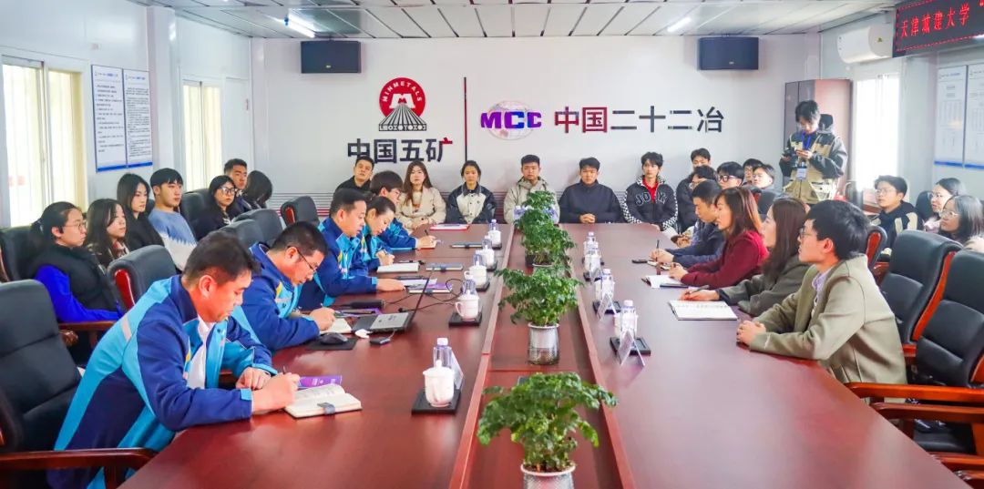 在项目现场实践研学结束后,校企双方举行座谈会并进行互动交流。中国二十二冶集团有限公司天津分公司党委书记王利锋对bevictor伟德官网师生的到来表示欢迎,并围绕公司的组织架构、发展情况、校企合作等方面进行了介绍。项目经理丁世伟重点介绍了项目整体概况、项目管理、智能建造、绿色建造等方面的特色亮点工作。伟德官网2022届校友、人力资源部宋英杰就职业规划、能力培养等方面与同学们进行了交流。学校党委学工部相关负责人分别围绕学校发展沿革、专业优势特色、毕业生就业以及学生培养等方面进行了交流。