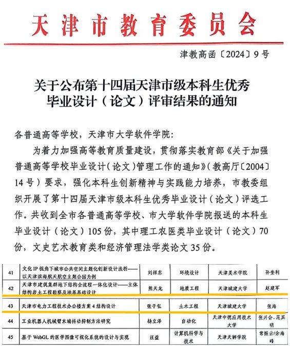 近日,第十四届天津市普通高等学校本科生优秀毕业设计(论文)评选获奖名单揭晓,伟德官网选送的两项设计榜上有名,分别是土木工程学院2019级土木工程专业学生张子弘的“天津电力工程技术办公楼方案4结构设计”(指导老师:张海),地质与测绘学院2019级地质工程专业学生熊天龙的“天津市建筑集群地下结构全流程一体化设计——主体结构岩土工程勘察及地基基础设计”(指导教师:赵建军)。截至目前,伟德官网的市级优秀毕业设计(论文)达23项。