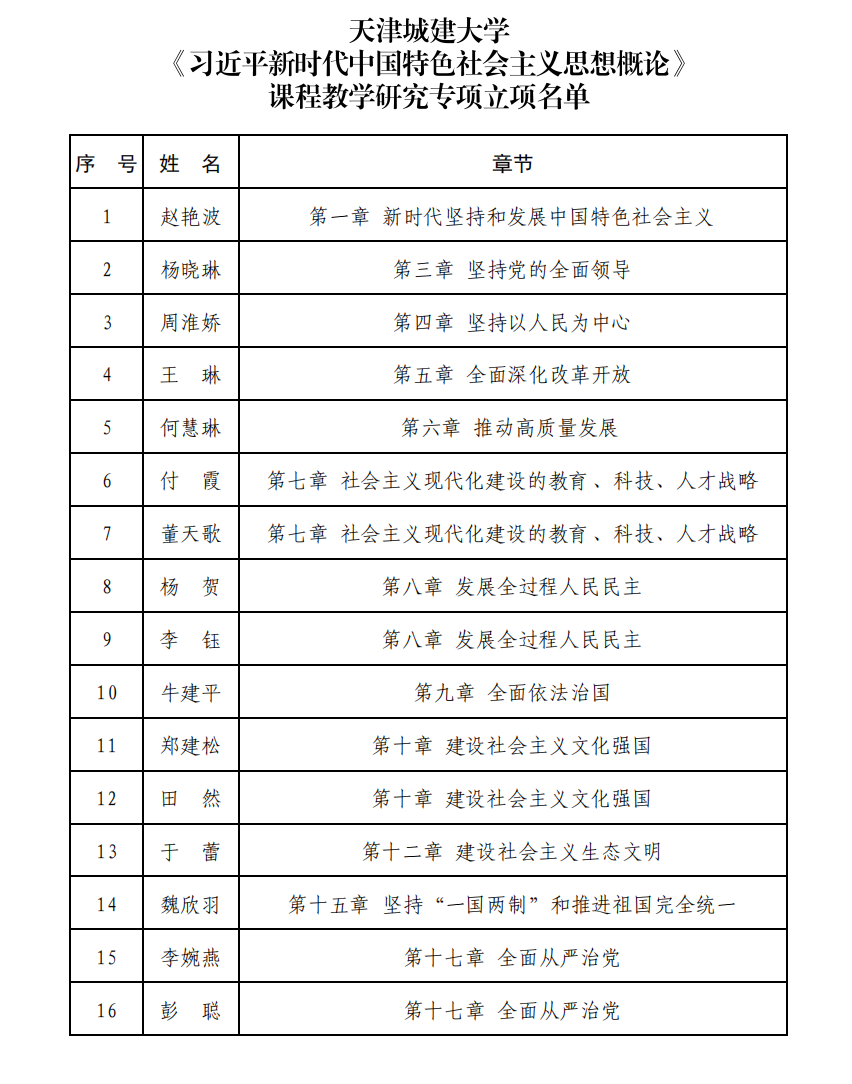 据悉,《习近平新时代中国特色社会主义思想概论》课程教学研究专项是为深入贯彻习近平新时代中国特色社会主义思想,落实《关于深化新时代学校思想政治理论课改革创新的若干意见》,特在天津市哲学社会科学规划项目和天津市教育两委项目中设立的专项。该课题依据《习近平新时代中国特色社会主义思想概论》课程统编教材涵盖的导论及17章作为主体内容,确立18个专题研究方向,以导论和各章标题为立项题目,分别设立教学研究课题。