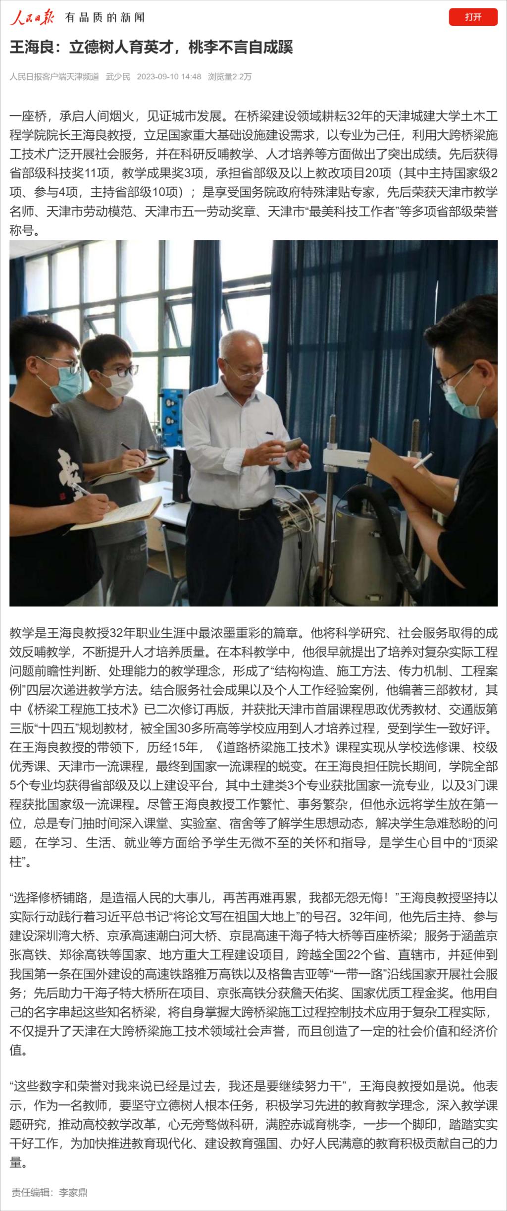 王海良教授以他对教育事业的热爱和执着,在科研的田野上探索出了一条又一条教育改革的路径;他积极参与国内外重大基建项目,在教育的花园里培养了一代又一代土木工程的人才。他用自己的言传身教,激励着学生们追求卓越,以自身的实际行动,推动学校教育再上台阶。他不仅是学生们的学术导师,更是他们的人生导师,引领着他们走向成功的道路。让我们一同跟随媒体的镜头,去感受这位教育巨匠的魅力和风采,去领略他为教育事业所付出的辛勤与汗水,去体验他为学生们所创造的无限可能与希望。以下是部分报道: