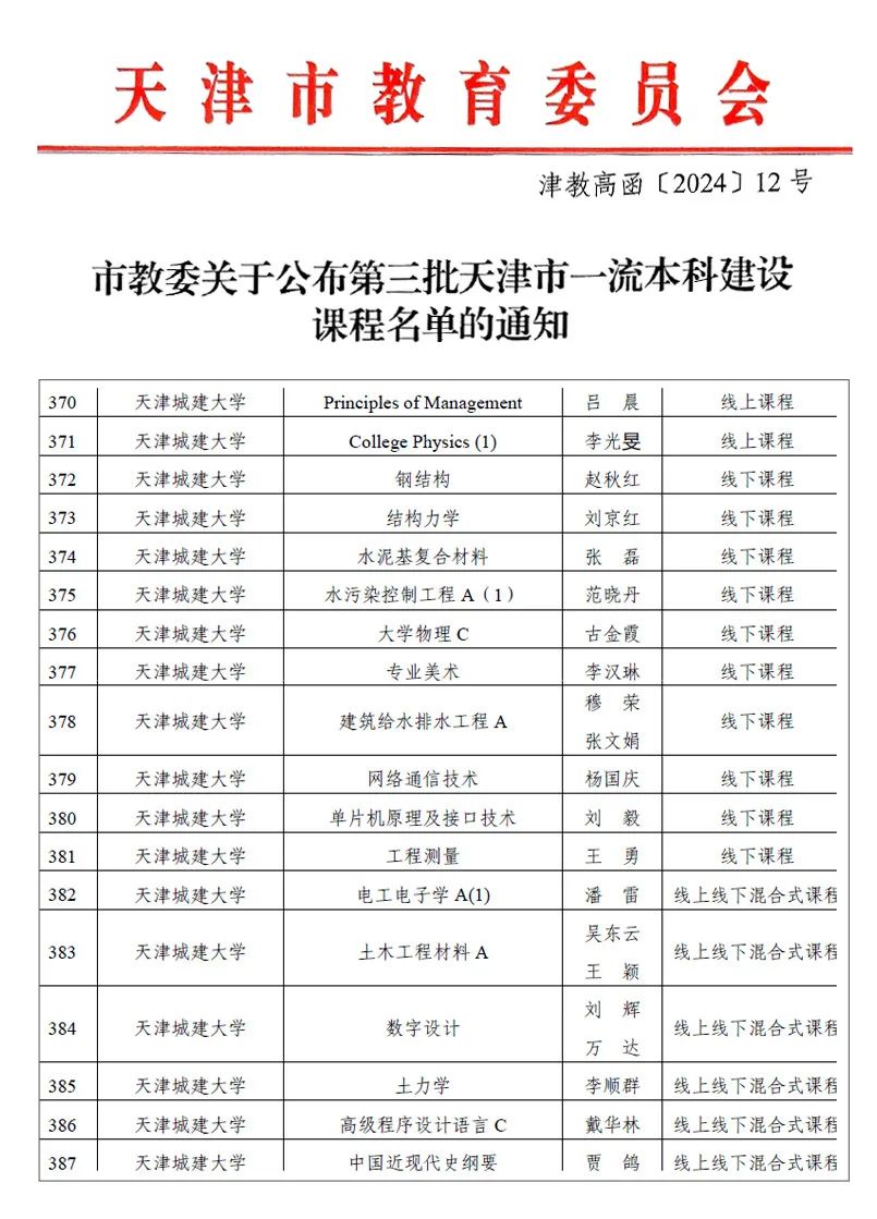 近日,天津市教委发布《市教委关于公布第三批天津市一流本科建设课程名单的通知》,伟德官网共有18门课程获批第三批天津市一流本科建设课程。其中,线上课程2门,线下课程10门,线上线下混合式课程6门。至此,学校已获批市级及以上一流本科课程52门(含国家级一流本科课程5门),课程建设取得新突破。
