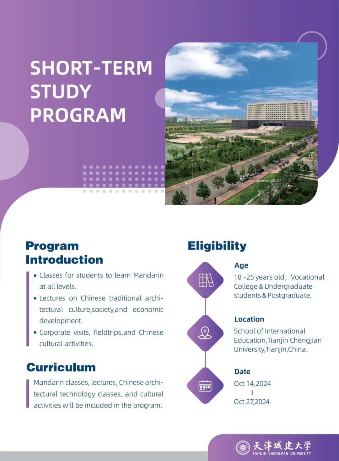 伟德官网短期学习项目包括汉语学习、中国文化体验和中国建筑技术等3个主题活动,项目时长2周,围绕天津历史建筑和城建文化等主题开展汉语文化体验活动和建筑业相关技术宣讲,让留学生在体会汉语独特的魅力的同时,感受兼具传统和现代特色的中华建筑文化,更全面、深入地了解当代中国。