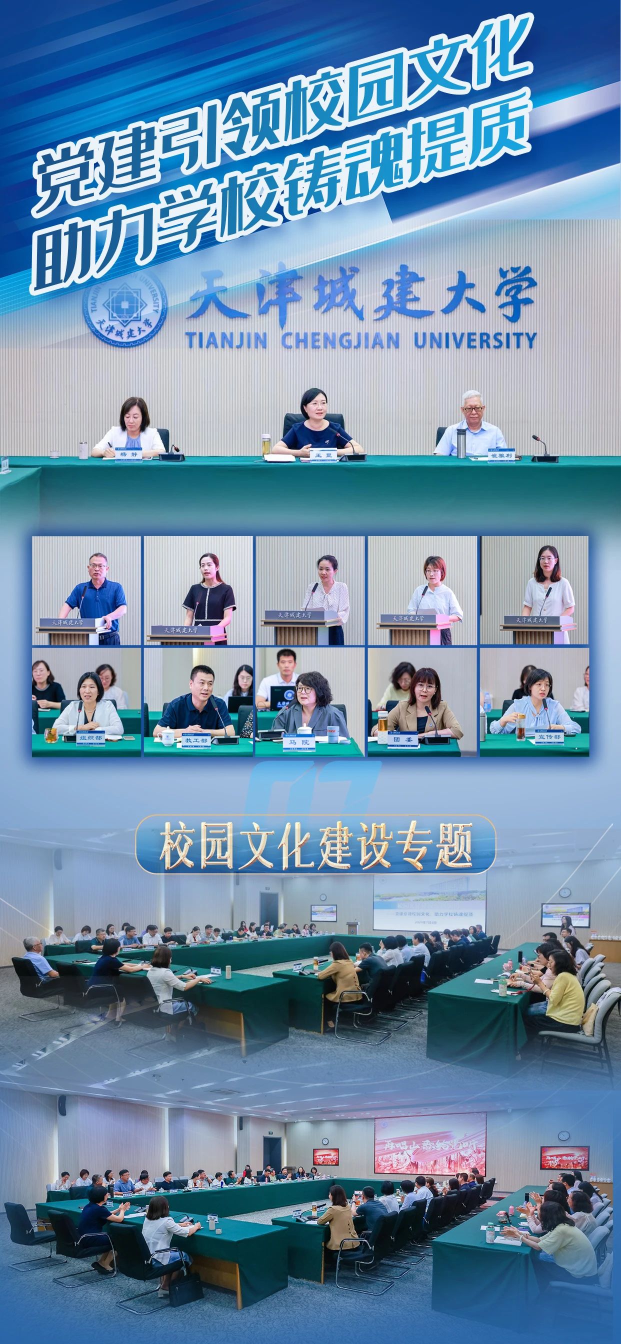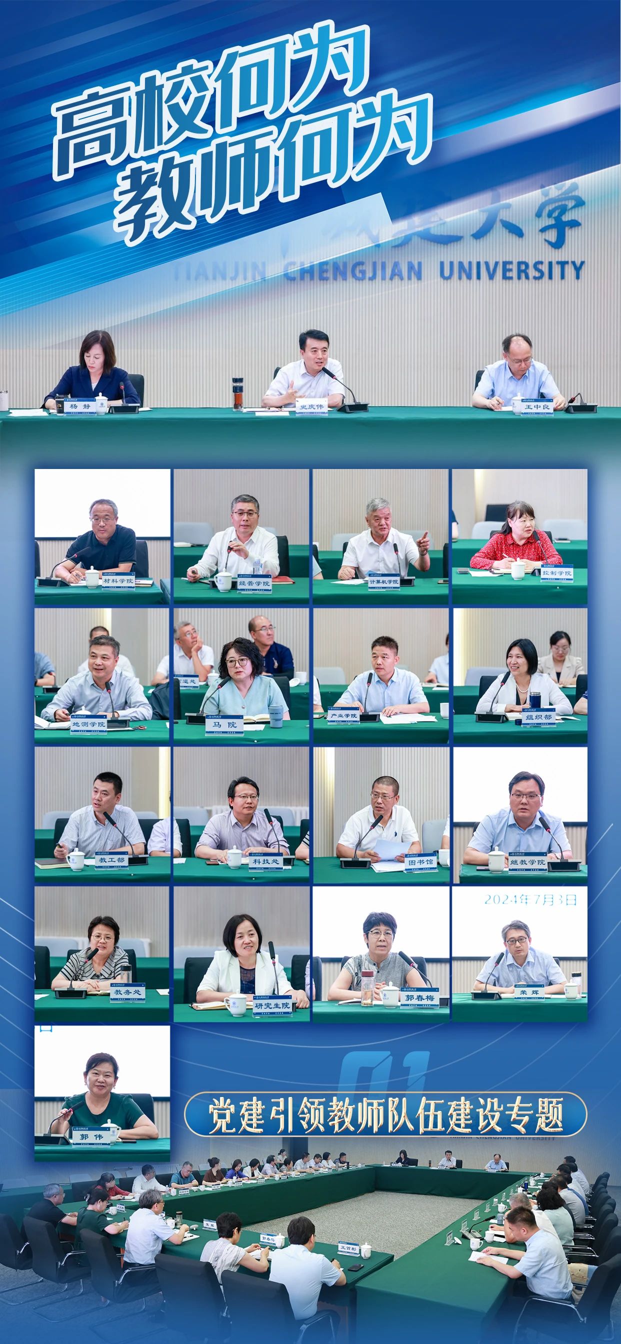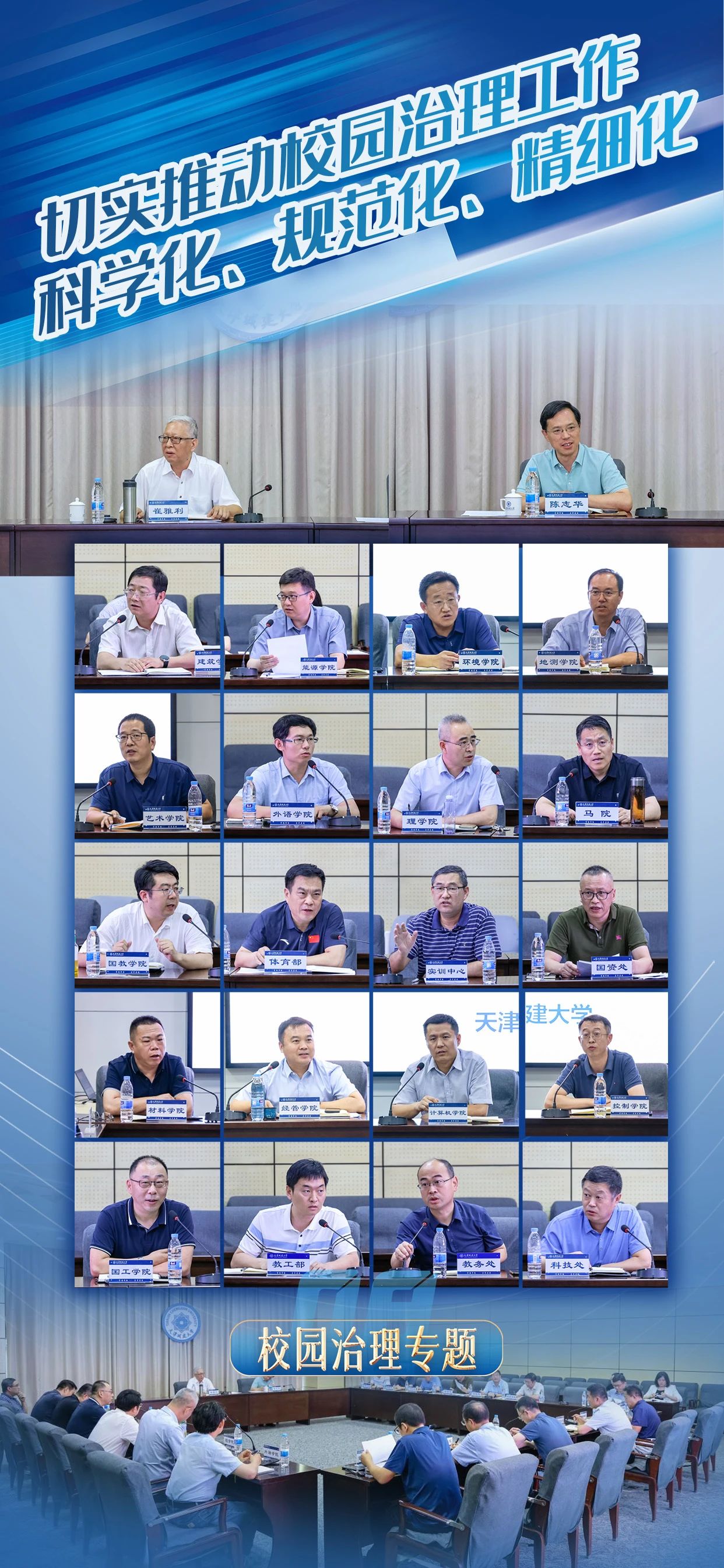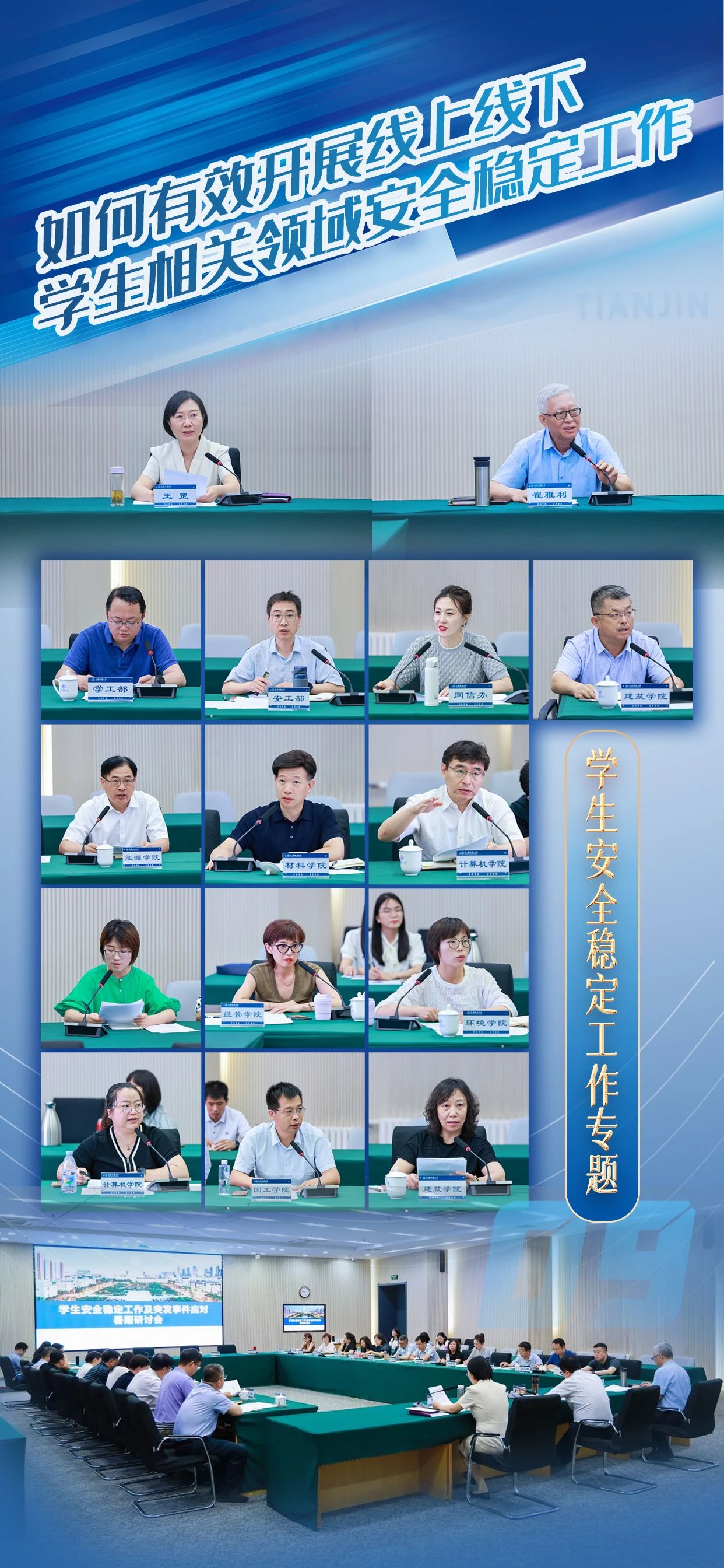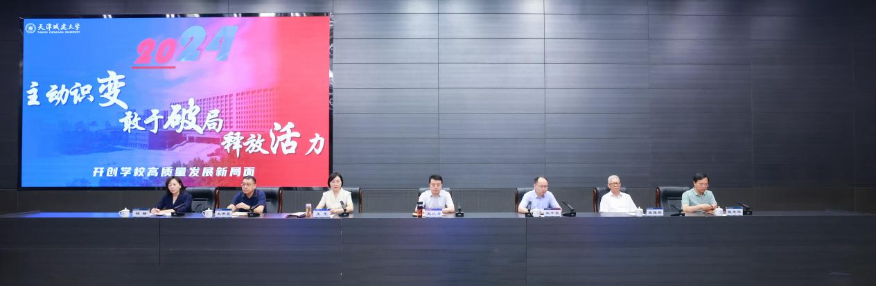 史庆伟全面凝练了上半年学校党的建设和事业发展优势特色亮点,并对下一步工作进行部署要求:一要以政治建设为统领,扎实推进党纪学习教育深入开展,持续推动基层党组织全面进步全面过硬;二要坚持以学生党建为龙头,强化“卓越思政”质量提升计划;三要充分发挥党建引领作用,不断完善教师党建和思想政治工作评价体系,构建高层次人才队伍体系和青年人才发展培育体系;四要以扩面推进新工科专业建设为契机,加大学科专业结构调整力度,创新人才培养模式;五要以新一轮本科教育教学审核评估为契机,推进教学管理体制机制改革创新;六要开展有组织的科研,发挥学校特色学科群优势,全面提升服务国家战略及天津经济社会发展的能力;七要抓好安全稳定工作,坚定不移贯彻总体国家安全观,筑牢校园安全稳定防线,推动平安校园建设提质增效。
