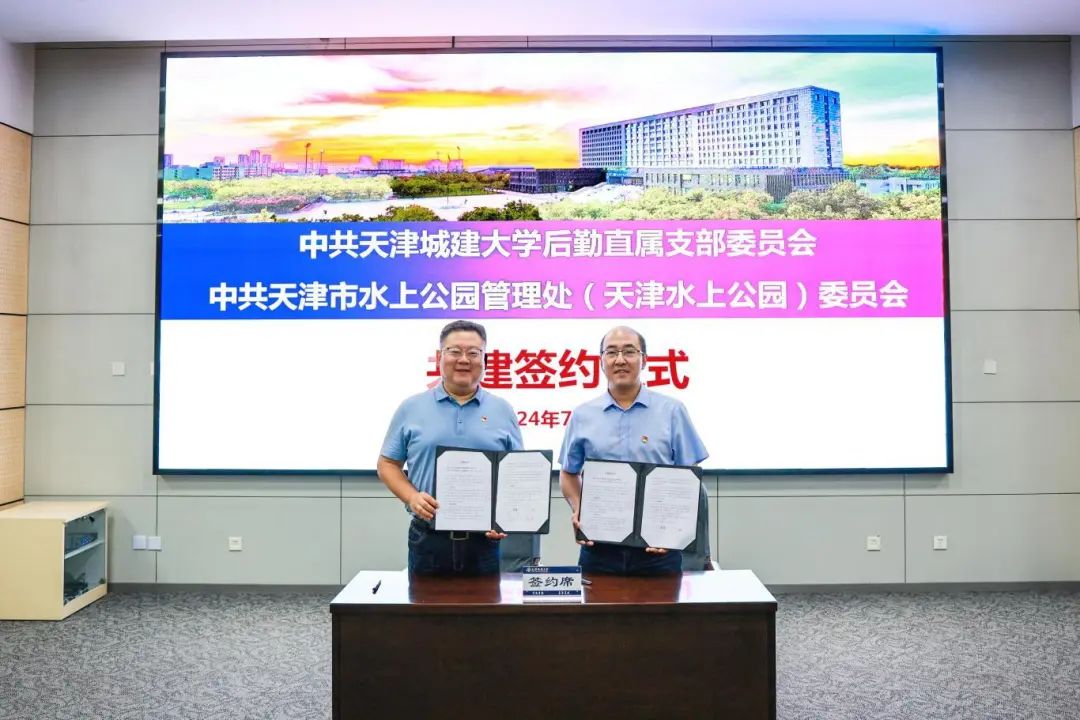 共建仪式上,伟德官网后勤处处长、后勤直属党支部书记(兼)贾凤勇与水上公园党委副书记、园长贾非共同签订了共建协议。双方就加强党组织的联系协作,共同探索生态校园建设新途径以及服务美丽天津建设等内容开展深入交流。